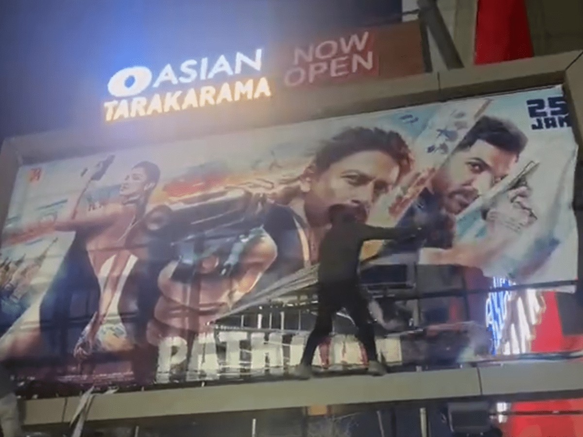 Hyderabad: Mild tension prevailed at two movie theatres in Kachiguda when a group of right-wing workers from Bajrang Dal staged demonstrations demanding the screening of the movie ‘Pathaan’ be stopped.