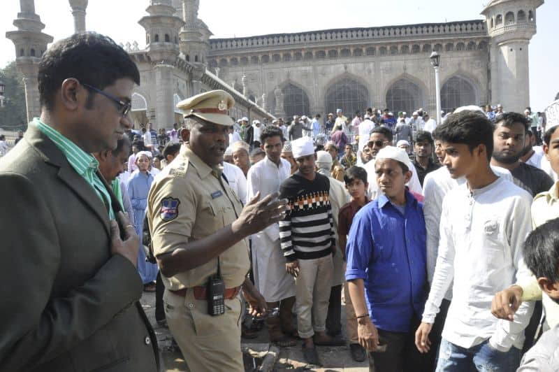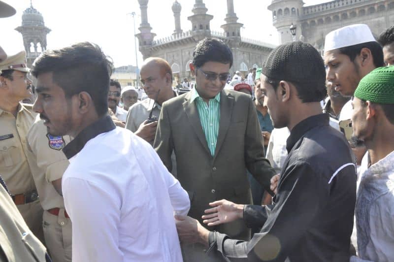 City Police Commissioner V Srinivas Rao greeted Muslims after Friday prayers outside historical Makkah Masjid in Hyderabad. DCP Babu Rao and senior police officials were also present. (Pics. Mazher)