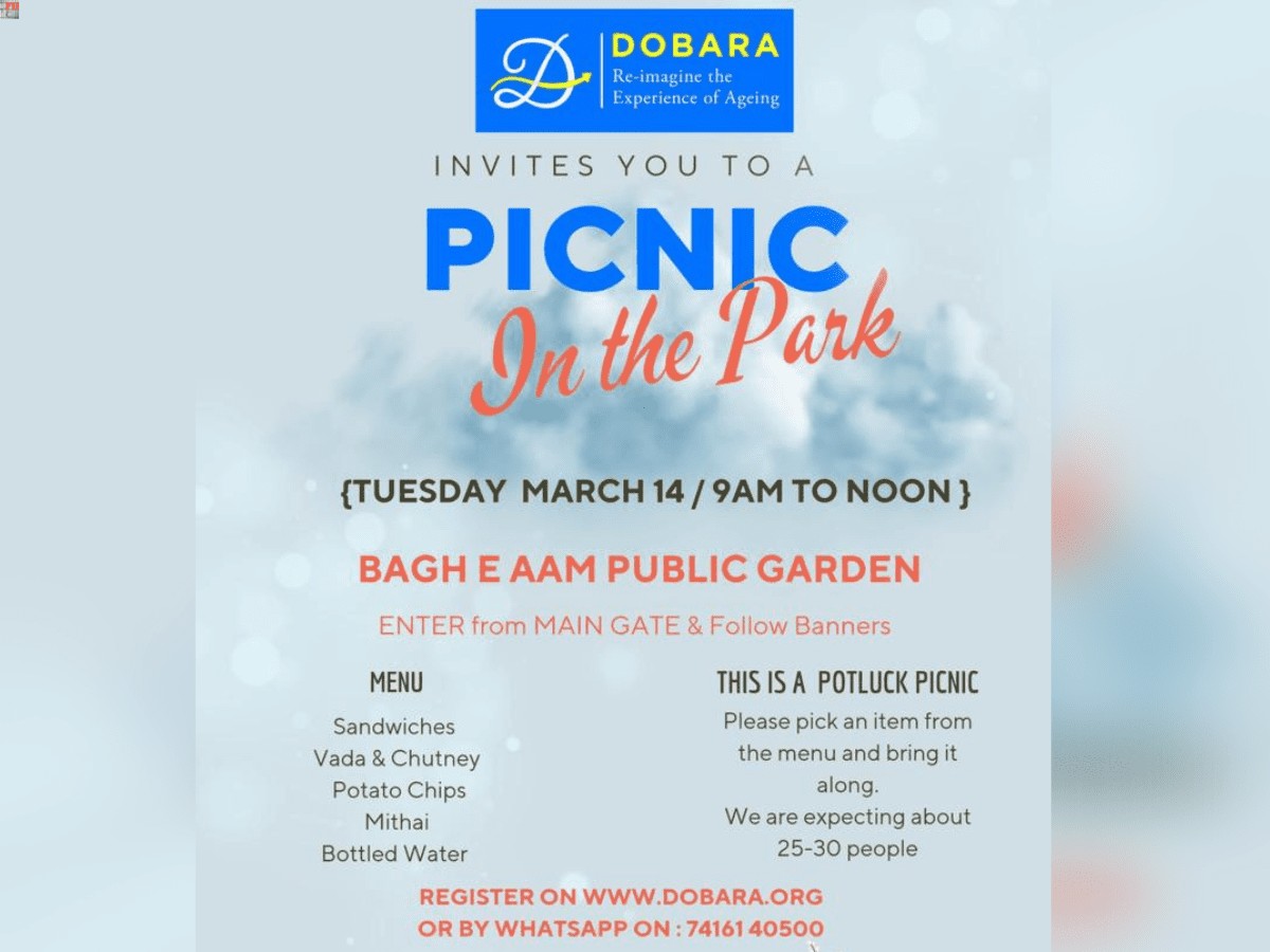 Hyderabad: Dobara, a city-based non-profit organisation for the elderly is holding a pre-summer picnic at Public Garden located in Nampally on March 14.