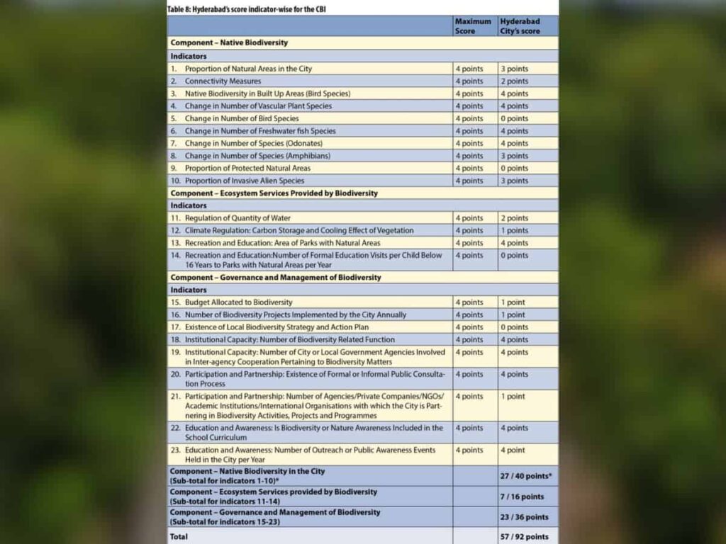 A total of 92 marks are allotted for 23 biodiversity indicators. Hyderabad secured 57 out of 92 marks in the latest index prepared by the Greater Hyderabad Municipal Corporation (GHMC). The city received only 36 out of 92 marks in 2012.