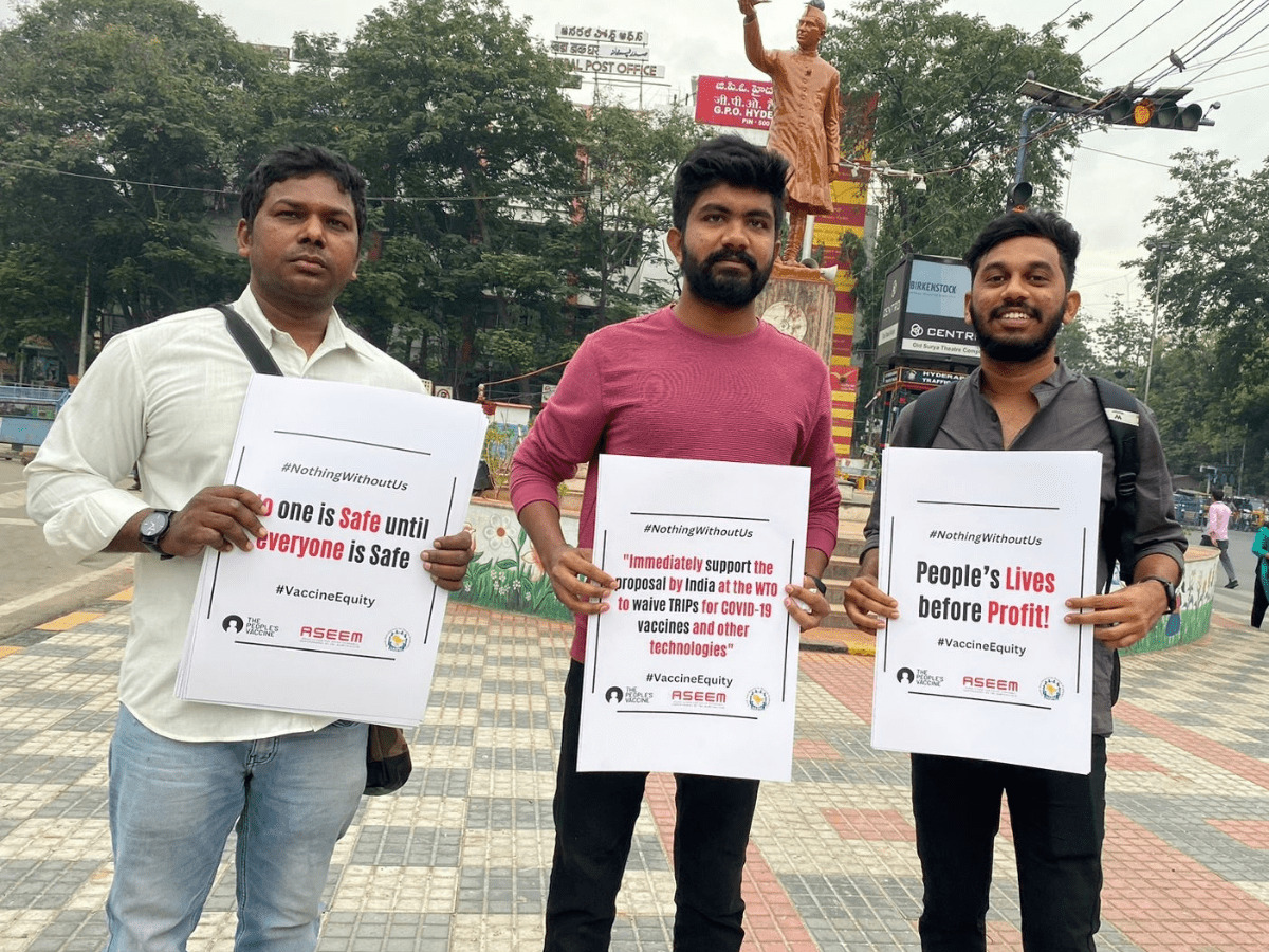 ASEEM organised the protest in collaboration with South Asia Alliance for Poverty Eradication (SAAPE) with the slogan, “No one is safe until everyone is safe.” The NGO expressed solidarity with the demand for vaccination equality among the least developed countries.