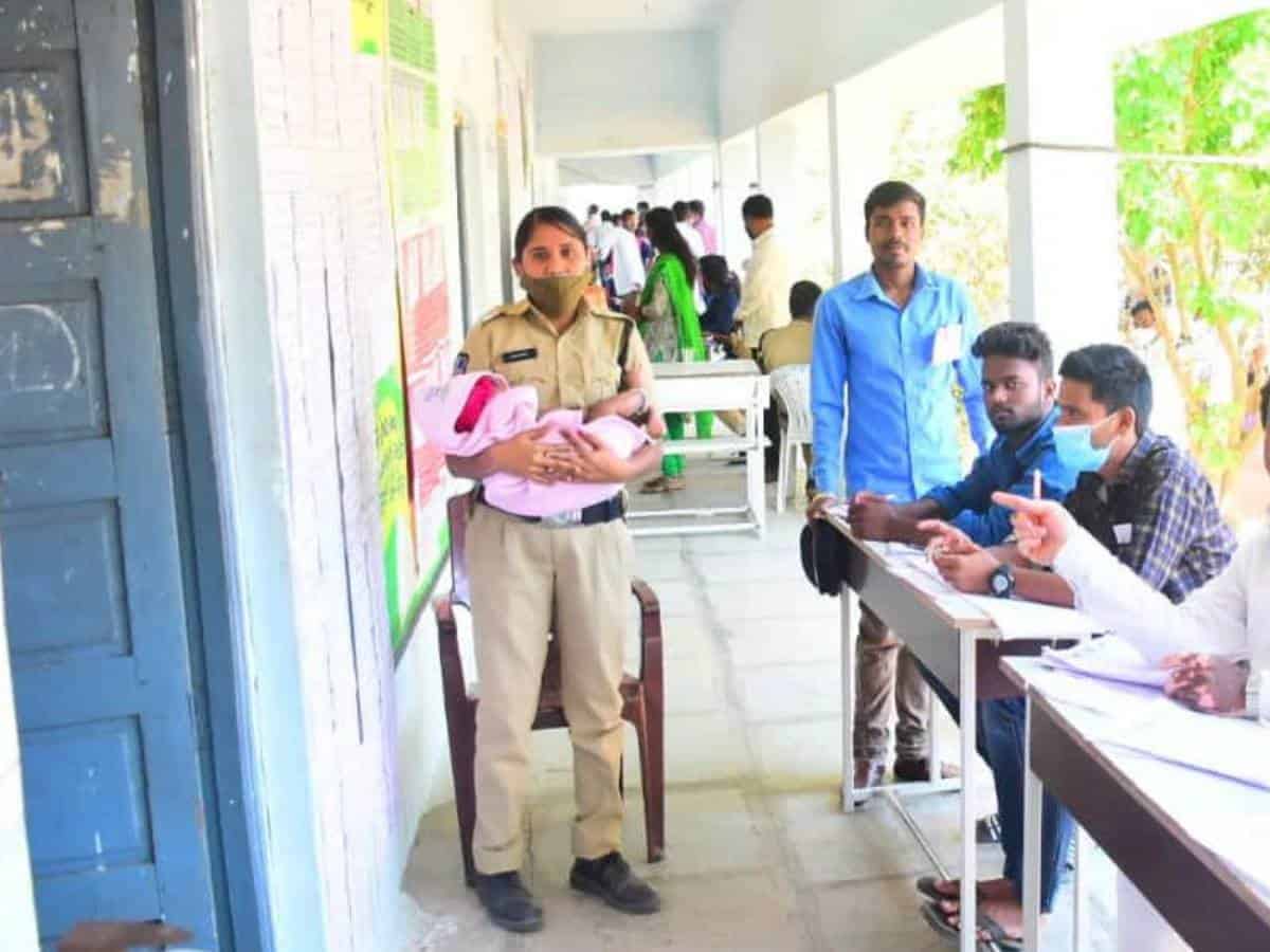 Hyderabad: A heartwarming gesture from a woman cop looking after an infant while also performing her duty on polling day has gone viral. The incident took place a day earlier on March 14, on the day of polling for two MLC seats (graduates constituency).