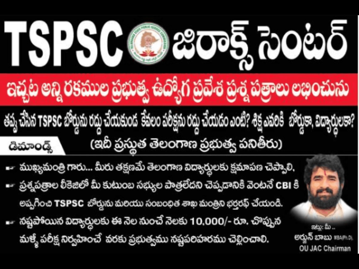 The poster reads “Instead of dissolving the TSPSC board the government postponed the exams. This is the working style of the Telangana government.”