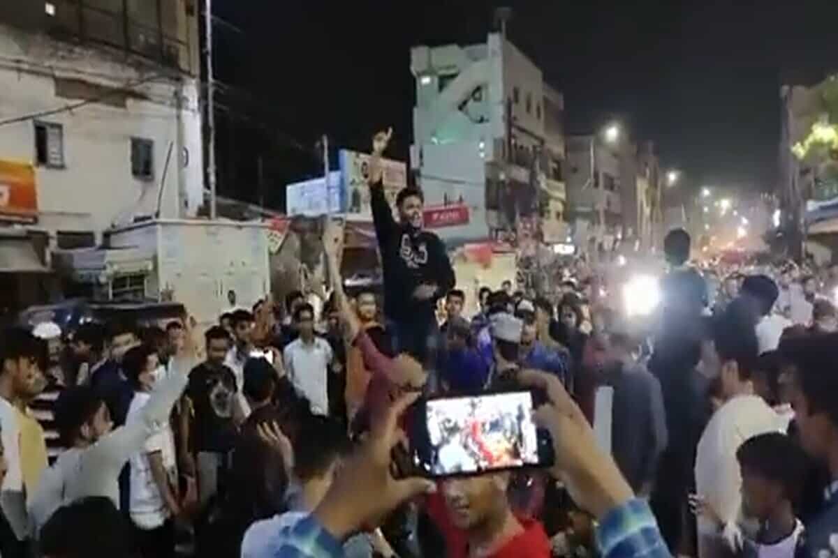 Crowds of people sloganeered demanding that Raja Singh be delivered capital punishment for his alleged comments at Dabeerpura Darwaza.