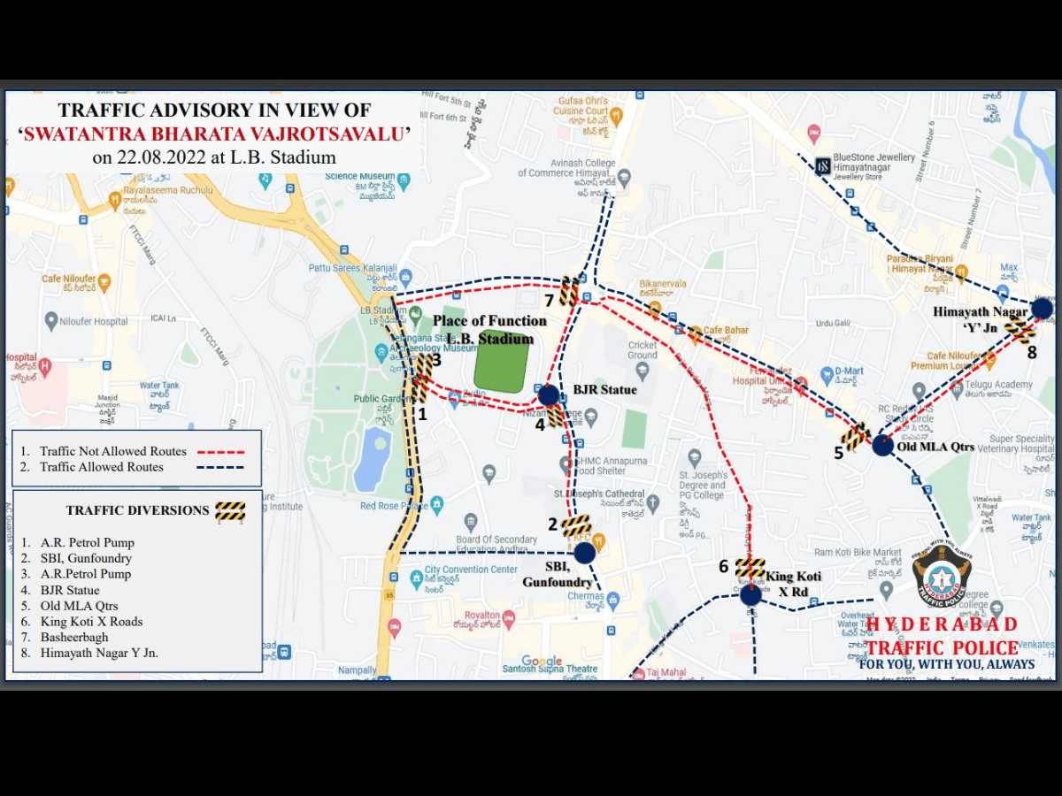 Traffic coming from Ravindra Bharathi and Hill Fort road and intending to proceed towards B.J.R. Statue will not be allowed and will be diverted towards Nampally.