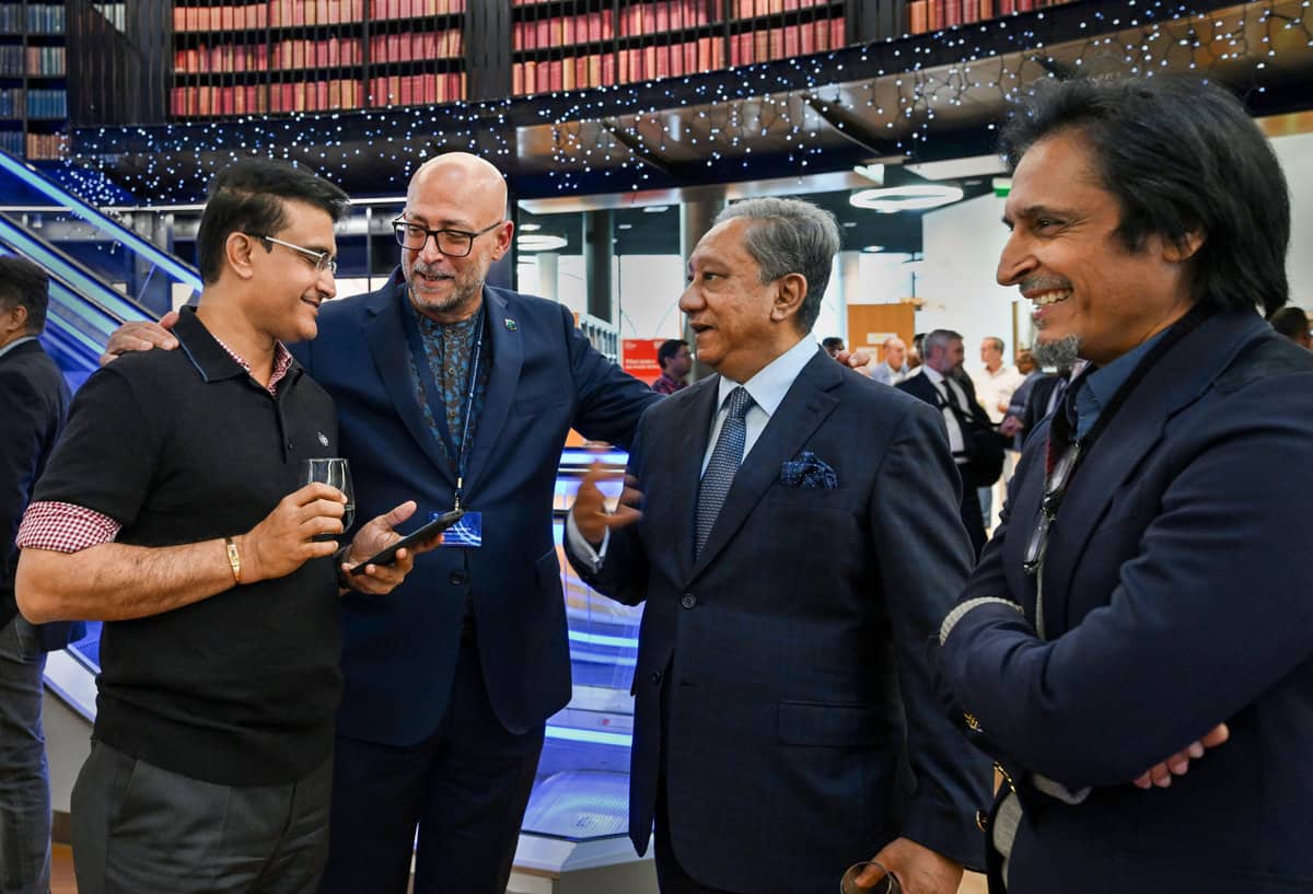 Birmingham: BCCI President Sourav Ganguly with BCB Chairman Nazmul Hassan and Pakistan Cricket Board (PCB) Chairman Ramiz Raja during a party ahead of ICC Board meeting, at the Library of Birmingham, Tuesday, July 26, 2022. (PTI Photo/R Senthil Kumar) Birmingham: BCCI President Sourav Ganguly ahead of the ICC Board meeting, at the Library of Birmingham, Tuesday, July 26, 2022. (PTI Photo/R Senthil Kumar) Birmingham: BCCI President Sourav Ganguly with BCB Chairman Nazmul Hassan and Pakistan Cricket Board (PCB) Chairman Ramiz Raja during a party ahead of ICC Board meeting, at the Library of Birmingham, Tuesday, July 26, 2022. (PTI Photo/R Senthil Kumar)