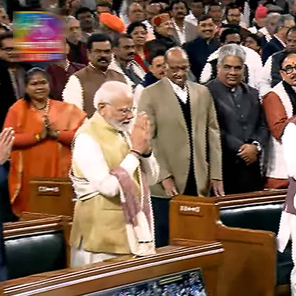 New Delhi: President Droupadi Murmu exchanges greetings with Prime Minister Narendra Modi and other members as she leaves after her address to the joint session of Parliament on the opening day of the Budget Session, in New Delhi, Tuesday, Jan. 31, 2023. (PTI Photo)