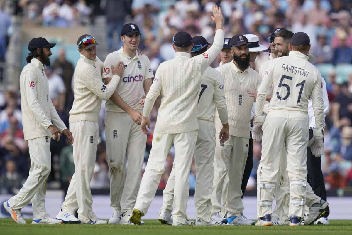 London: India’s Umesh Yadav, left celebrates after taking the wicket of England’s Joe Root clean bowled on the first day of the 4th cricket Test between England and India at The Oval cricket ground in London, Thursday, Sept. 2, 2021. AP/PTI