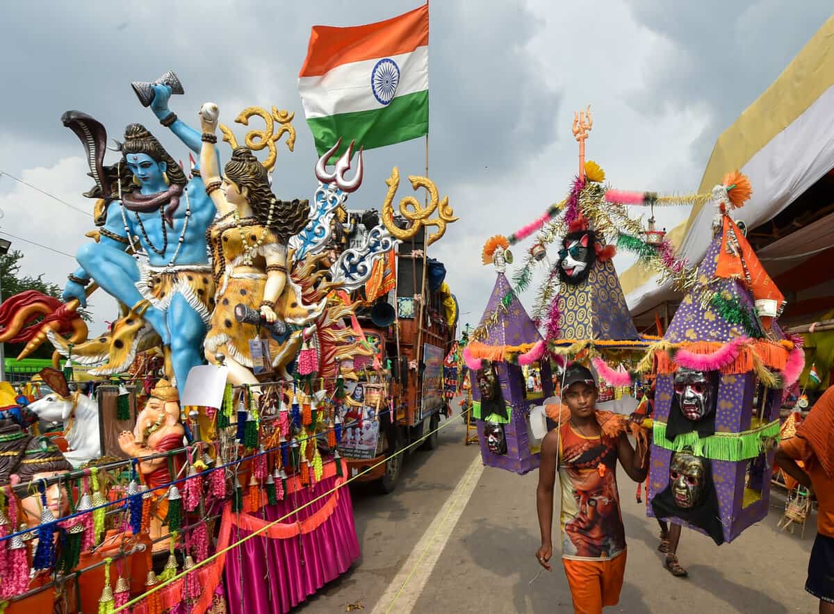 New Delhi: Lord Shiva devotees or ‘Kanwariyas’ purchase the tricolor, during their pilgrimage in the month of ‘Shravan’, in New Delhi, Sunday, July 24, 2022. (PTI Photo/Manvender Vashist Lav)