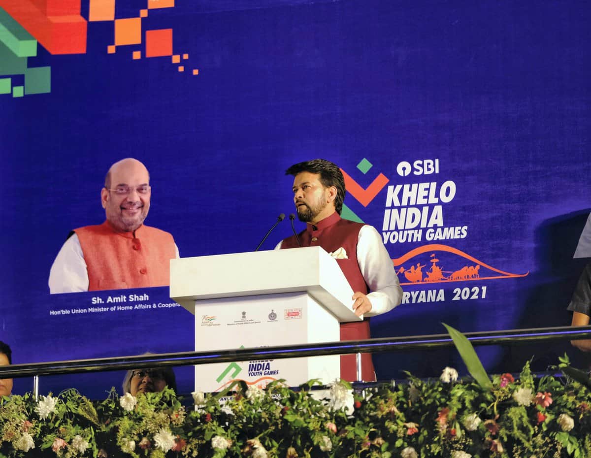 Panchkula: Union Home Minister Amit Shah, Union Sports Minister Anurag Thakur and others during the inauguration of Khelo India Youth Games at Tau Devi Lal Stadium, in Panchkula. (PTI Photo)