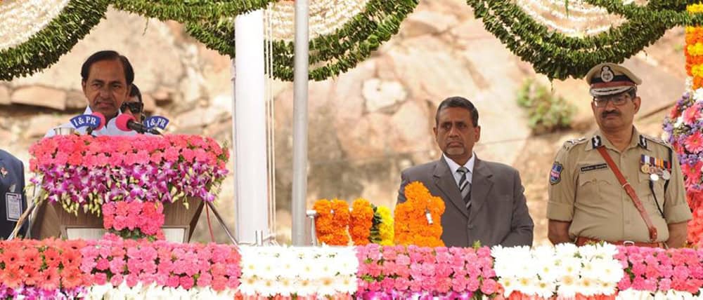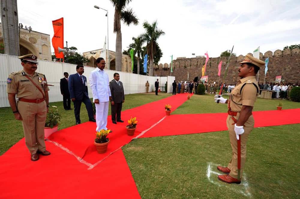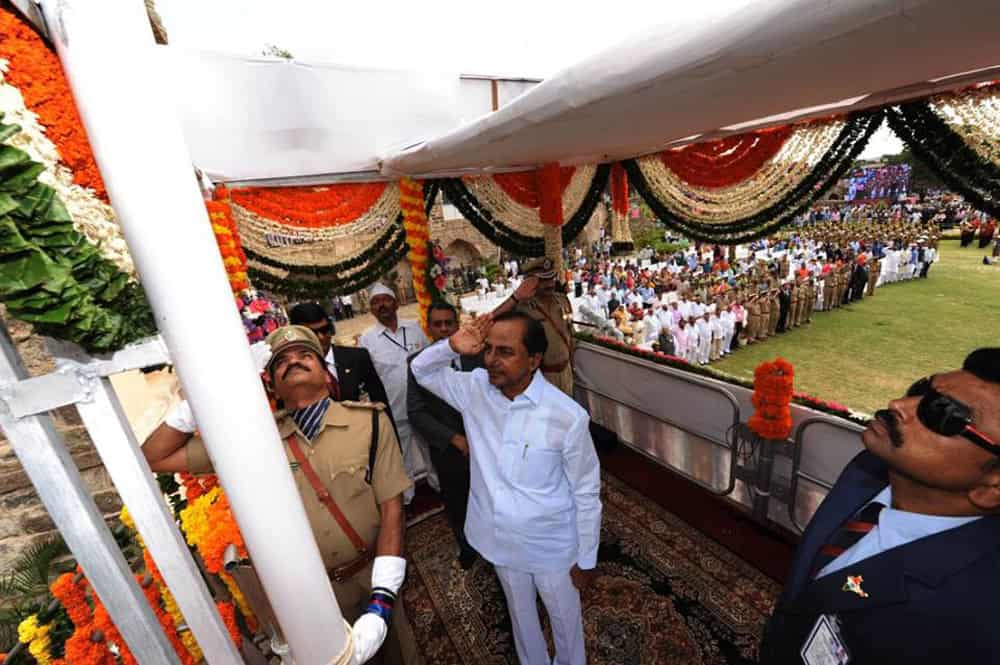 Extending 70th Independent Day Celebrations from the citadel of Historical Golconda Fort, Chief Minister K Chandrasekhar Rao today greeted the people of Telangana whose land is being purified with the holy waters of River Krishanaveni as the State is soaking in the 12-day Pushkaralu. When the national tricolor was infurled on the Golconda Fort premises, the State was a two-and-a-half month old infant and facing teething problems, he said. “Gradually the State government could give a stable government and in two years, we have crossed some milestones in the development and welfare sector and the nation is looking at us”, he claimed. The Chief Minister asserted that the youngest State was treading on a growth trajectory by maintaining cordial relations with the Centre and neighbouring States. As part of its goal to become No. 1 State in the country, the Telangana government succeeded in its efforts to ensure that the flagship programs are on a fast pace. (Photo: Zabi)