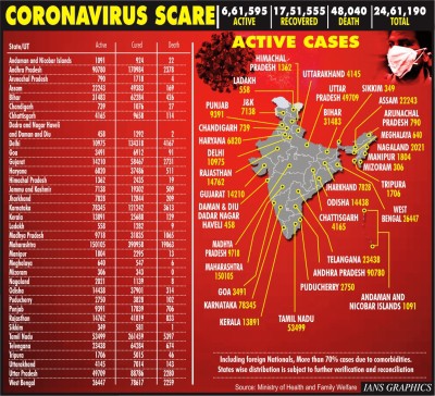 New Delhi, Aug 14 : India’s Covid-19 tally crossed the 24-lakh mark on Friday with 64,553 new cases in 24 hours, while the toll climbed to 48,040 with 1,007 more fatalities, said the Health Ministry.