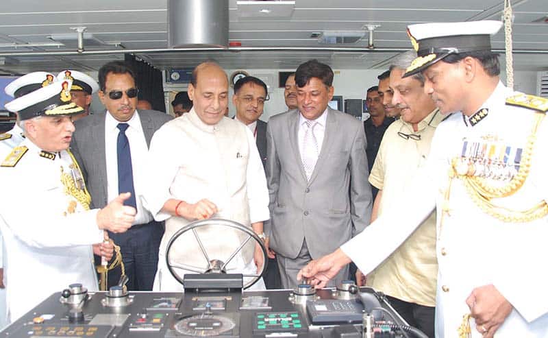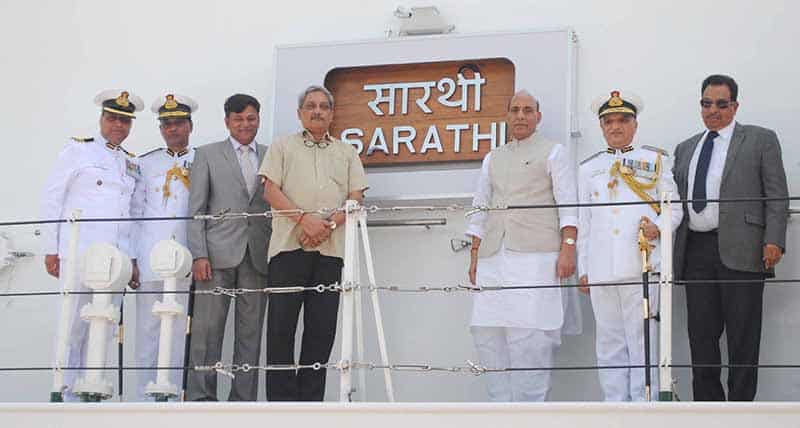 Union Home Minister Rajnath Singh and the Union Minister for Defence Manohar Parrikar commissioning the Indian Coast Guard Ship ‘Sarathi’, at Goa on Friday. UNI PHOTO