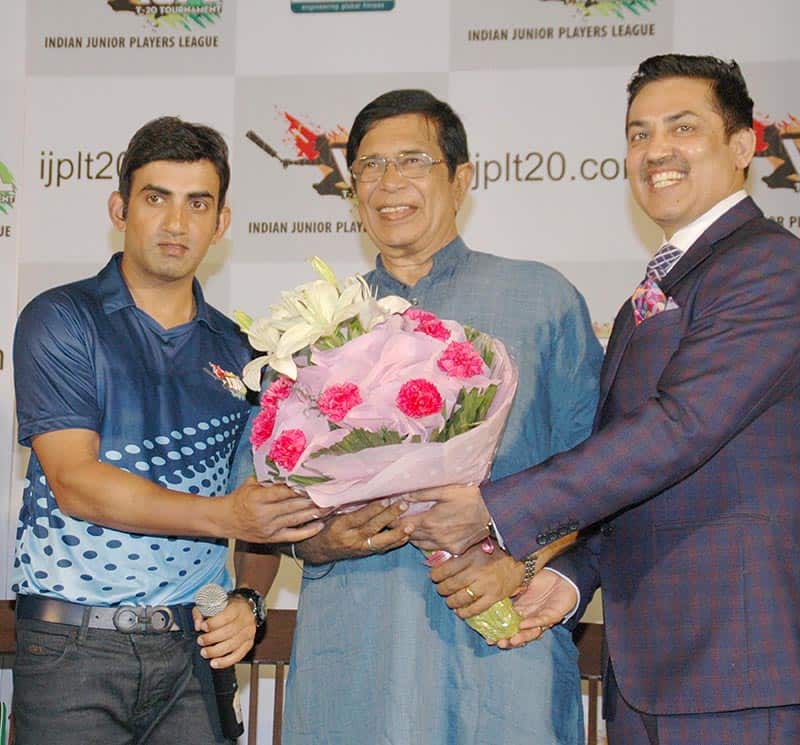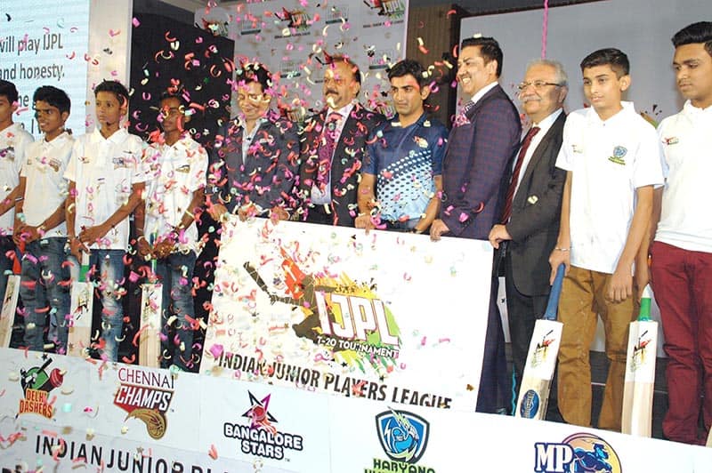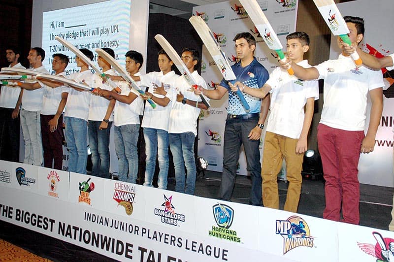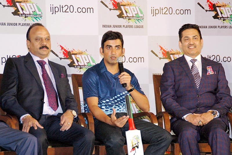 Cricketer Gautam Gambhir with players during the announcement of Indian Junior Players League (IJPL) T-20, in New Delhi on Thursday. UNI PHOTO
