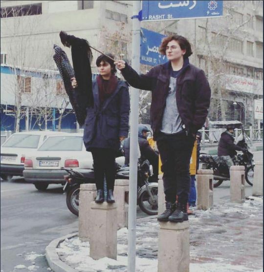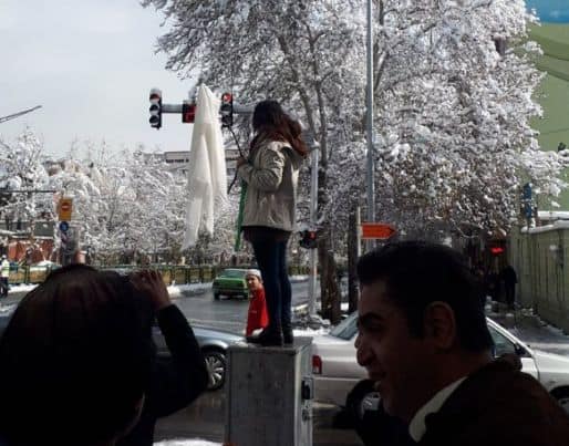The protests appear to mirror that of a woman who stood in Tehran’s busy Enghelab (Revolution) Street in December without a headscarf and waving a white scarf on a stick.