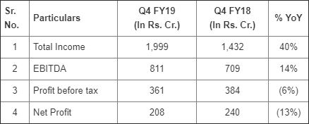 For the entire FY19, Company’s EBITDA went up by 10 percent to Rs 3,133 Cr; whereas the Q4 EBITDA went up by 14 percent to Rs 811 Cr Company registered Q4 profit of Rs 208 Cr.