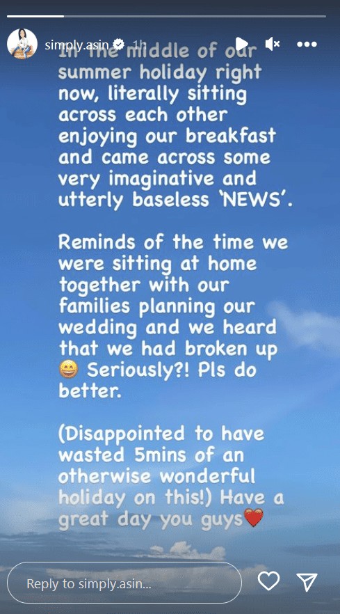 Reminds of the time we were sitting at home together with our families planning our wedding and we heard that we had broken up. Seriously? Pls do better. (Disappointed to have wasted 5 mins of an otherwise wonderful holiday on this ! ) Have a great day you guys.”
