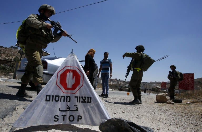 Israeli soldiers control Palestinians at an entrance of the al-Fawwar refugee camp, south of the West Bank city of Hebron, on August 16, 2016 as the Israeli army conducts searches in the camp. Twenty-five Palestinians were wounded in clashes with Israeli soldiers conducting searches in a refugee camp in the southern West Bank on Tuesday, Red Crescent medics said. Some of the wounded had been hit by live ammunition, others by rubber bullets, the medics said. An Israeli army spokeswoman said the troops were conducting “activity to uncover weaponry” in the camp, when “dozens of Palestinians hurled IEDs (improvised explosive devices), blocks and rocks” at them.