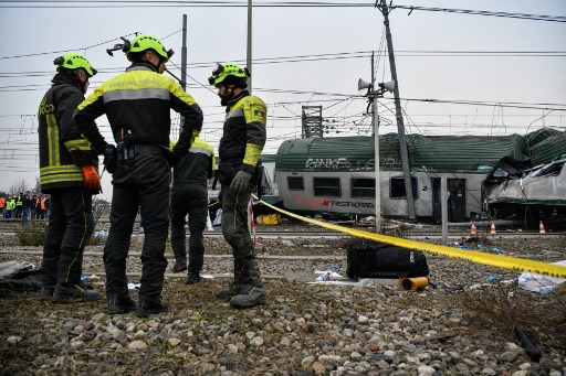 Italian rescuers, police and technicians work on the site of a train derailment, on January 25, 2018 near Milan. AFP