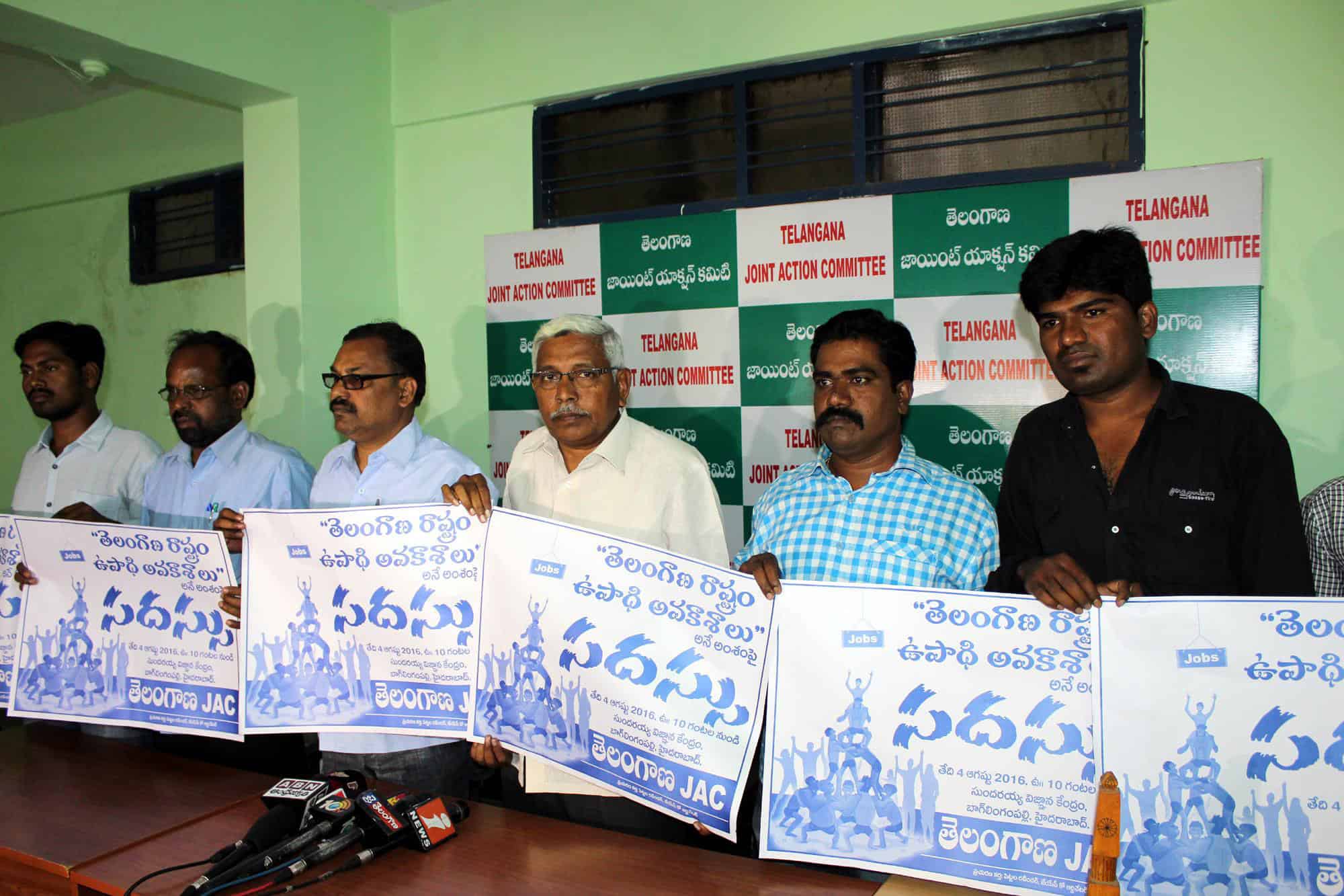 Prof. K. Kodandaram, President of Telangana Political Joint Action Committee released the post of the proposed conference on “Reforms and Opportunities of Jobs in Telnagana State”. Talking to newsmen yesterday Prof. Kodandaram told that this conference would be held on 4th August at Sundaryya Vijyamma Kendram, Lingampally. He informed that there are 80 lakh unemployed youths in the age group 18-35 years who are graduates or postgraduates. The remaining 60 lakh youths are less educated. It is, therefore essential to reform the system in order to create jobs for the less educated youth force. He pointed out that due to shortage of water agriculture is proving less advantageous. There is need to impart professional training to unemployed youths. (Photo: Zabi)