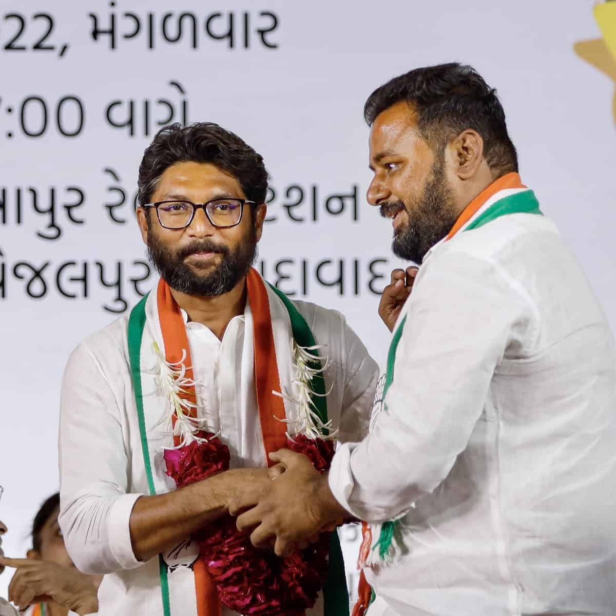 Ahmedabad: Congress leader Jignesh Mevani with party candidate from Vejalpur Rajendra Patel during a public meeting ahead of the Gujarat Assembly elections, in Ahmedabad, Tuesday, Nov. 29, 2022. (PTI Photo)Ahmedabad: Congress leader Jignesh Mevani speaks during a public meeting ahead of the Gujarat Assembly elections, in Ahmedabad, Tuesday, Nov. 29, 2022. (PTI Photo)Ahmedabad: Congress leader Jignesh Mevani with party candidate from Vejalpur Rajendra Patel during a public meeting ahead of the Gujarat Assembly elections, in Ahmedabad, Tuesday, Nov. 29, 2022. (PTI Photo)