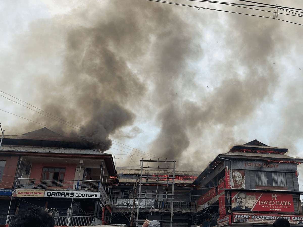 At least seven residential houses including a ‘U-shaped’ shopping complex were damaged after a massive fire broke out in a multi-storeyed shopping complex opposite Sir Syed Gate of the University of Kashmir in the Hazratbal area of Srinagar on Monday.
