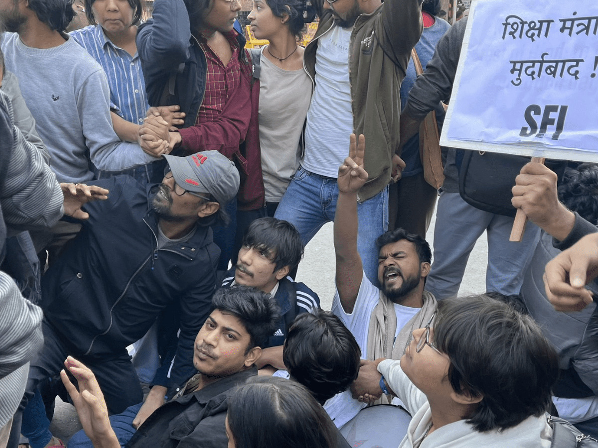 A number of students gathered outside the Shashtri Bhawan and hold placards and raised slogans against the Centre. They were detained by police and taken to Mandir Marg police station.