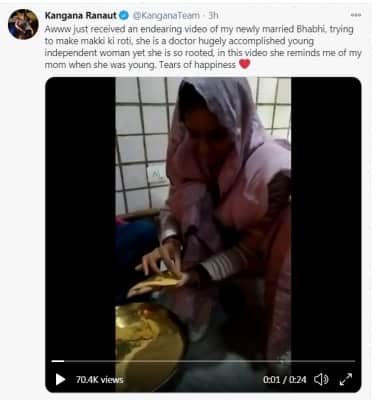 Kangana tweeted a video of her sister-in-law preparing makki ki roti, and wrote: “Awww just received an endearing video of my newly married Bhabhi, trying to make makki ki roti, she is a doctor hugely accomplished young independent woman yet she is so rooted, in this video she reminds me of my mom when she was young. Tears of happiness.”