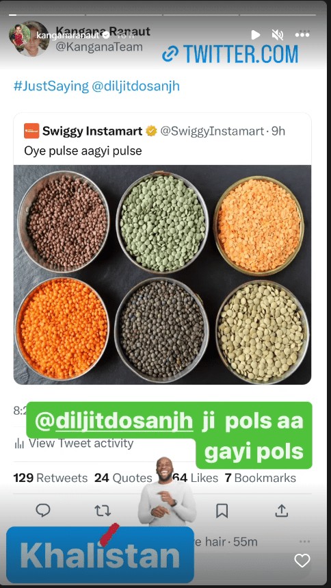 It showed a variety of lentils with ‘pulse aagai pulse’ written on it. Kangana tagged Diljit and wrote ‘just saying’. She added a Khalistan sticker on Instagram Stories, with the word crossed out.