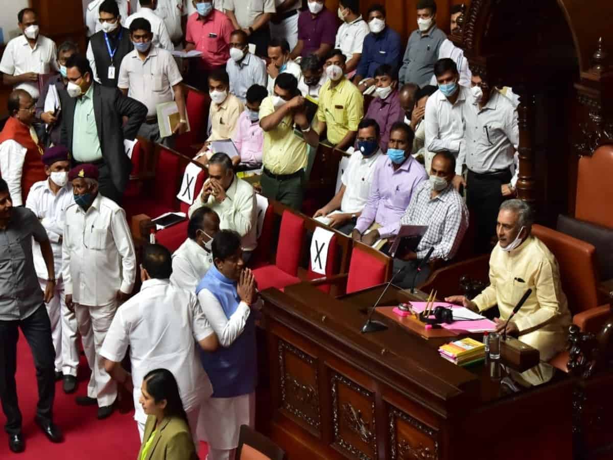The incident unfolded on Friday afternoon after the resumption of the upper house in the second half. Basavaraj Horatti, the chairman of the council, adjourned the session till 3 pm. The government had reportedly planned to table the bill in the second half but confusion prevailed since quite a few legislators left for their respective cities. Some of the BJP legislators tried to convince Horatti in his chamber, seeking permission to table the bill. Congress legislators S R Patil, Narayanaswamy, and B K Hariprasad opposed it.