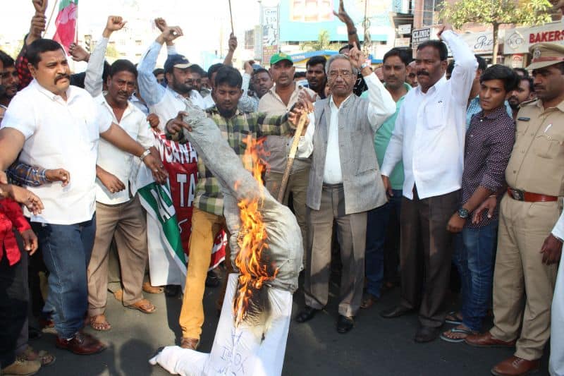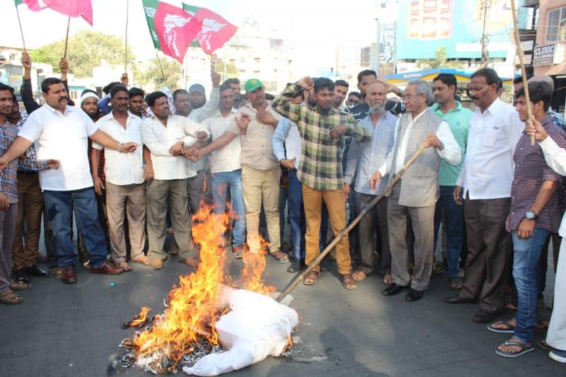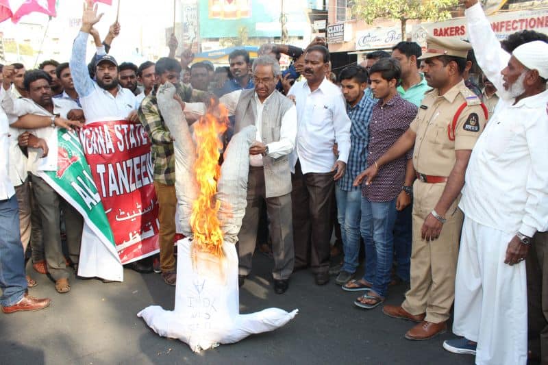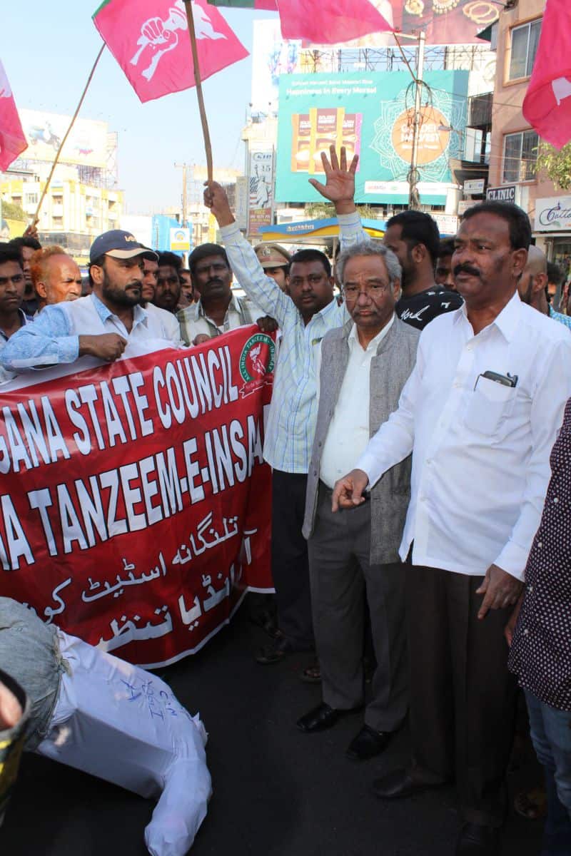 Under the leadership of Ex-MP and Nationl President Tanzeem e Insaaf Mr. Syed Azeez Pasha, the state Insaaf unit organized a protest programme against ‘Kasganj Communal Violence ‘ and burnt Chief Minister Yogi Adityanath’s effigy at Himayath Nagar, Y Circle. Stat Insaaf leaders and memebers can also be seen. (Photo: Zabi)