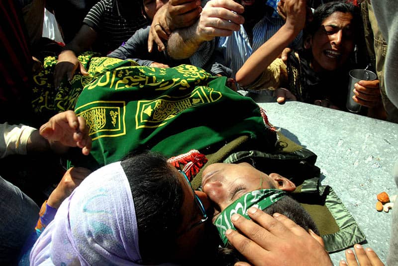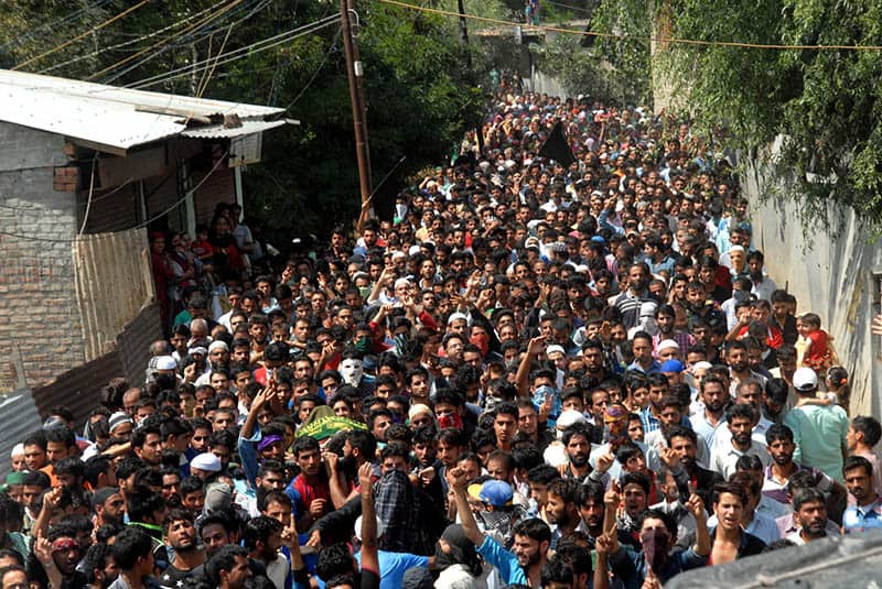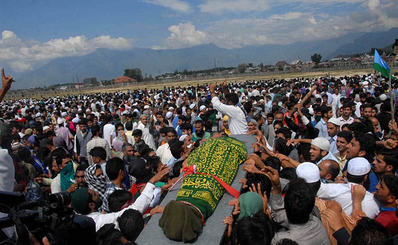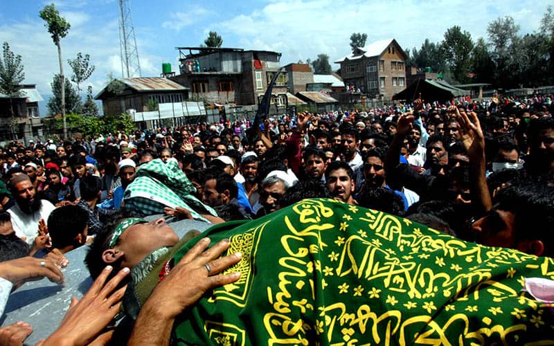 Mourners carrying the body of 12-year-old Danish to Idgah cemetery for burial, at Palpora-Noorbagh in Srinagar on Friday. Danish was drowned in Jehlum river after security forces chased youths. UNI PHOTO