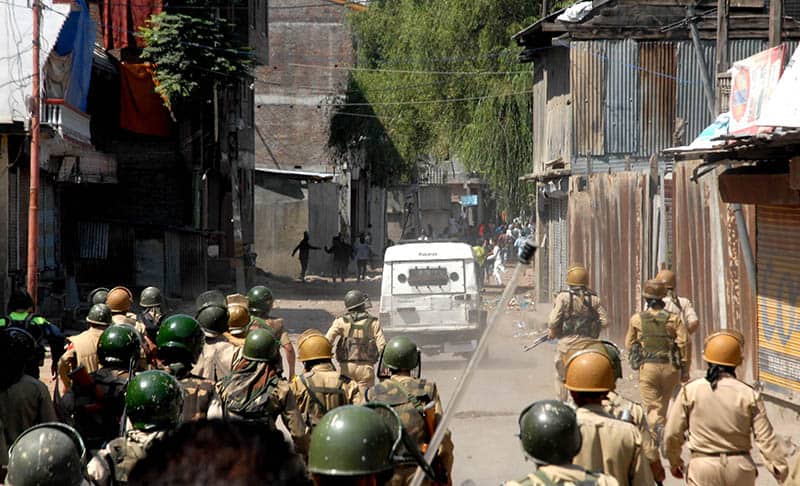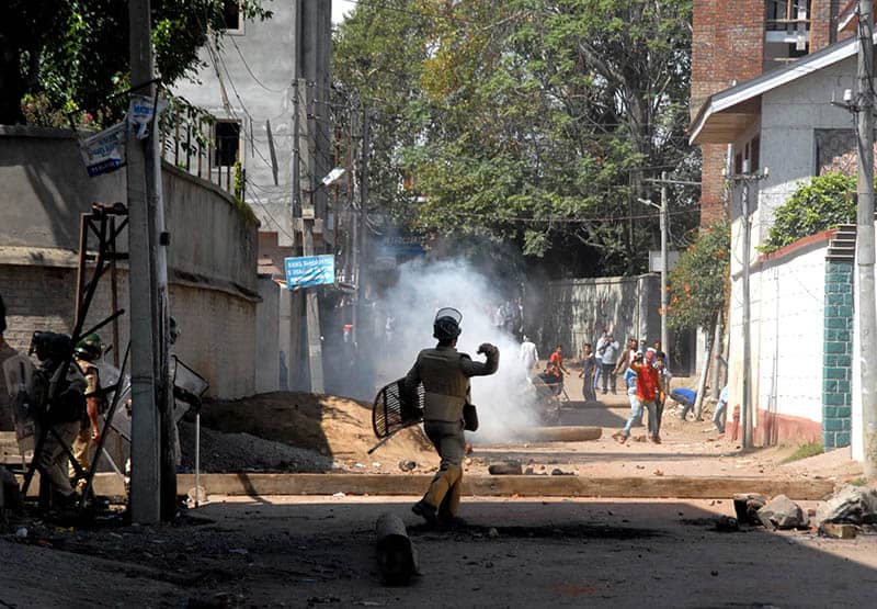 SRINAGAR, SEP 2 (UNI):- Security forces and Stone pelters engaged in a ding dong battle at Zampa Kadal where a 12-year-old Danish drowned in river Jehlum afterforces men chased youths at nearby Palpora-Noorbagh in Srinagar on Friday. UNI PHOTO – 121-U