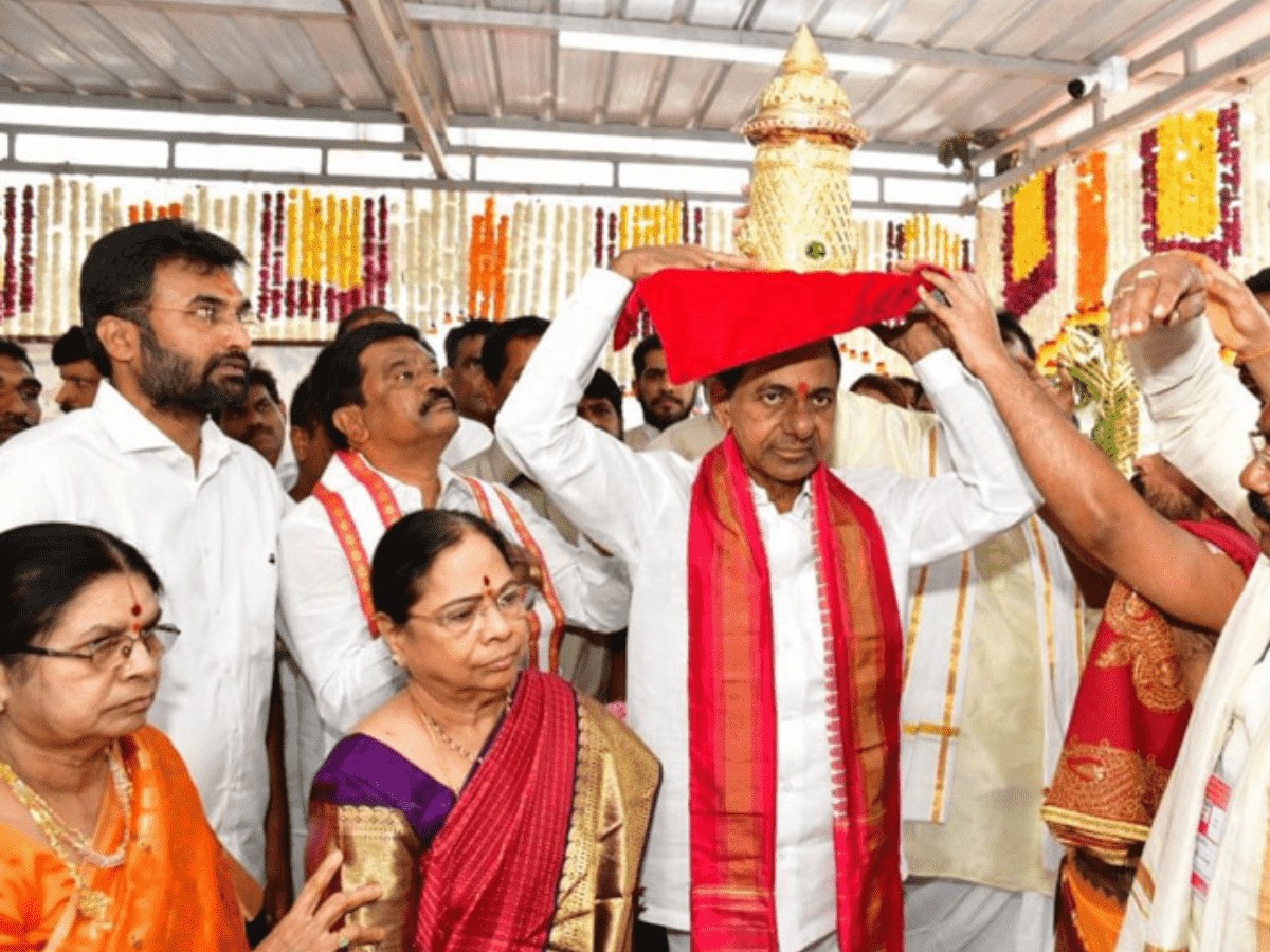 KCR along with his wife presented a two kilogram gold crown made by the family of Legislative Assembly Speaker Pocharam Srinivas Reddy to the presiding deity and offered special pooja as part of Brahmotsavam ceremony.