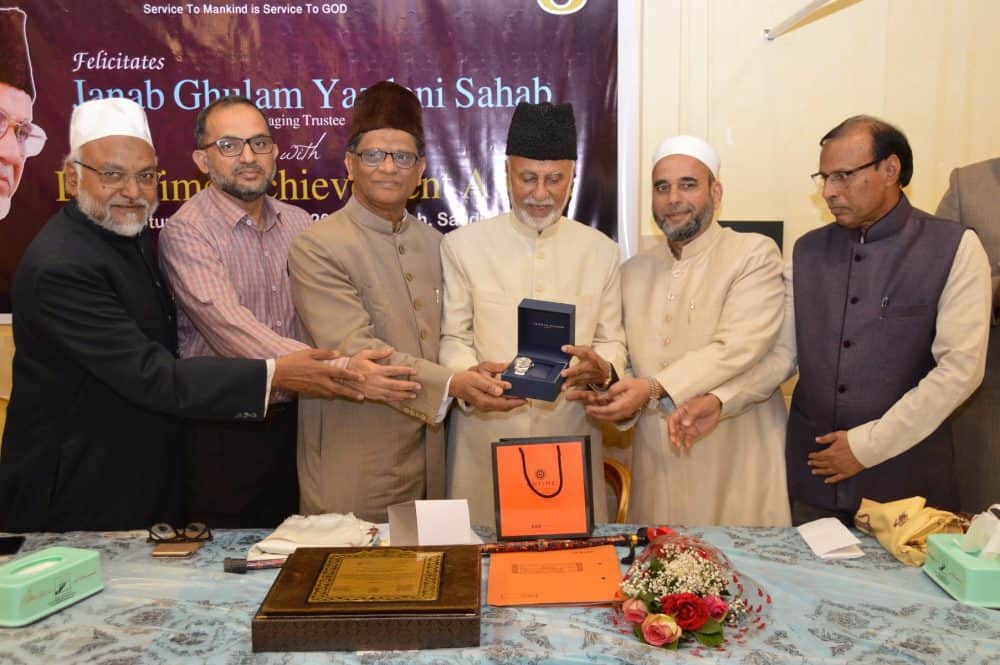 The life achievement memento was presented to Ghulam Yazdani Sahab, senior Advocate Hyderabad High Court and the Managing Trustee of KTT by the trustee of KTT Jeddah Shameem Kausar, Aijaz Ahmed Khan, Ahmed Abdul Hakeem and Syed Khaja Viqaruddin. The advisors of KTT including Dr. Ashraf Maniyar, Eng. Mohammed Sayeeduddin, Hassan Bayazeed, and Abdul Haq Hashmi presented a gift to the Managing Trustee of KTT and chief guest of the evening.