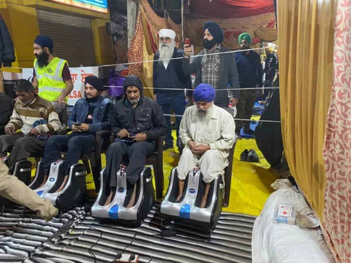 New Delhi: The international NGO Khalsa Aid on Friday set up a foot massage centre in makeshift spaces for the farmers who continue their protest against the farm laws at the Singhu border (Delhi-Haryana border).