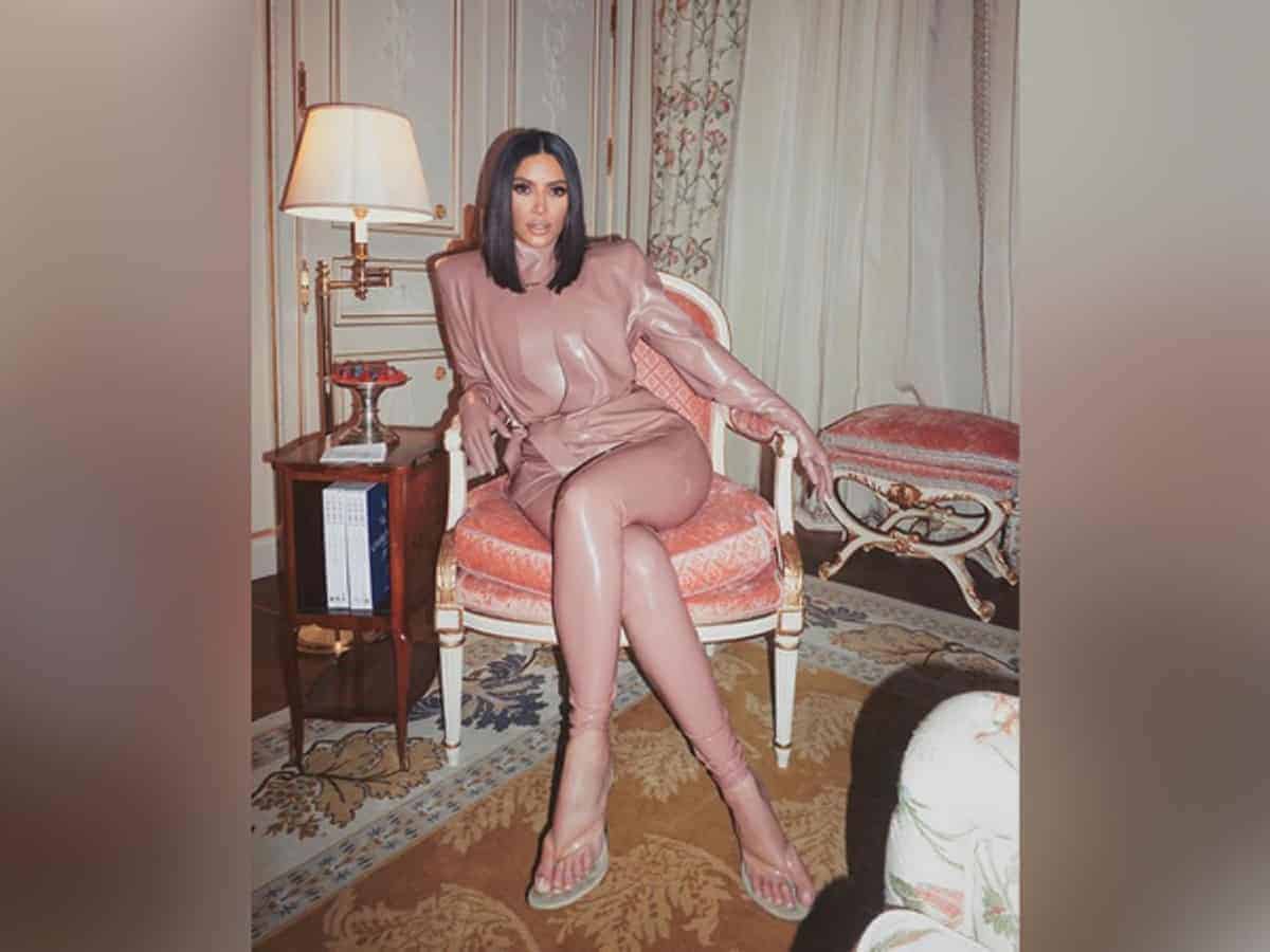 The reality TV star shared a set of four photographs on Instagram on Thursday where she is seen in a skin-tight, full latex salmon-toned two-piece suit while posing on a beautifully-upholstered chair and ottoman.