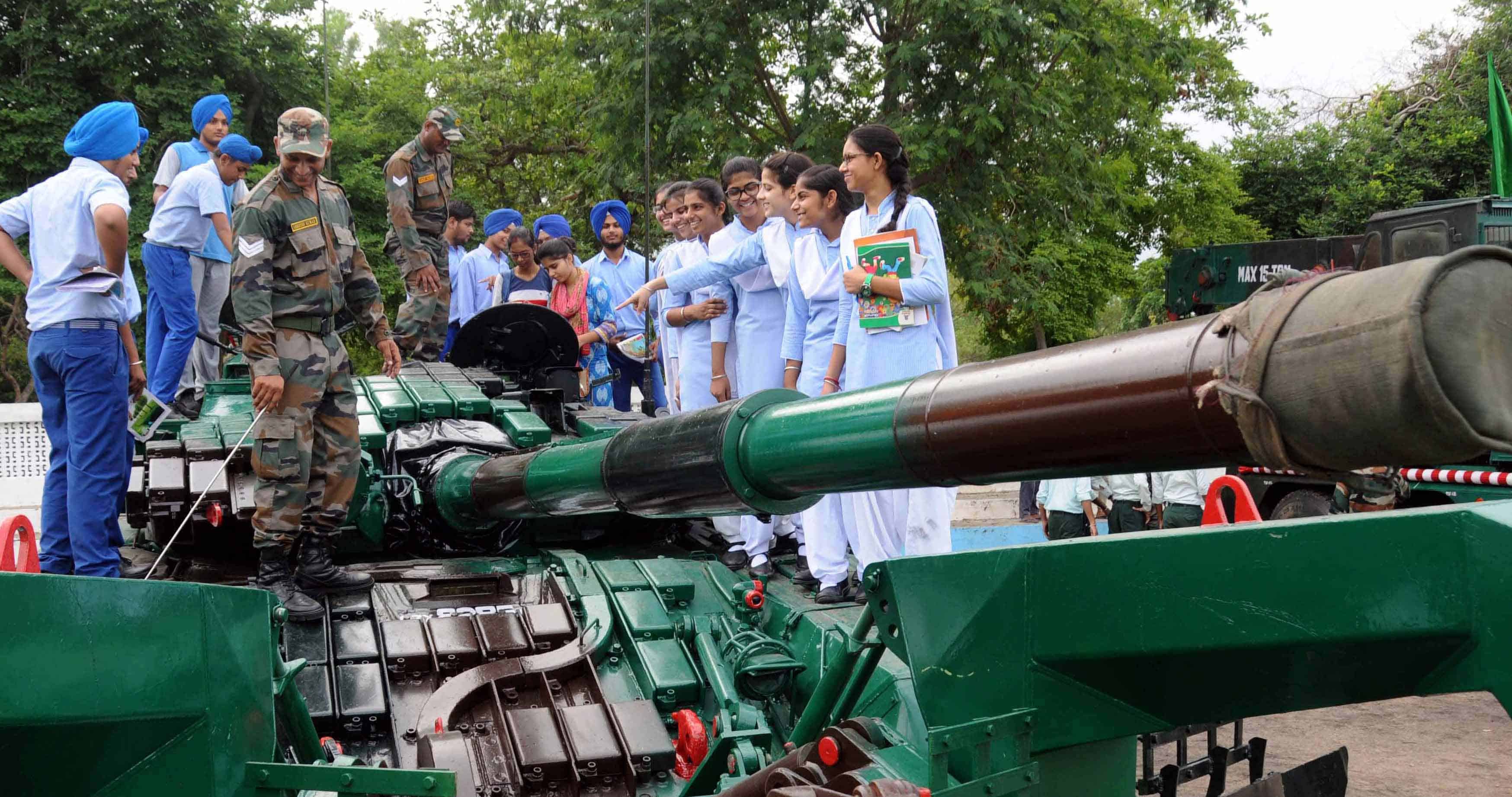 AMRITSAR, AUG 10 (UNI)- Students visiting at ‘Know Your Army’, an exhibition of military equipments in Amritsar on Wednesday. UNI PHOTO-106U