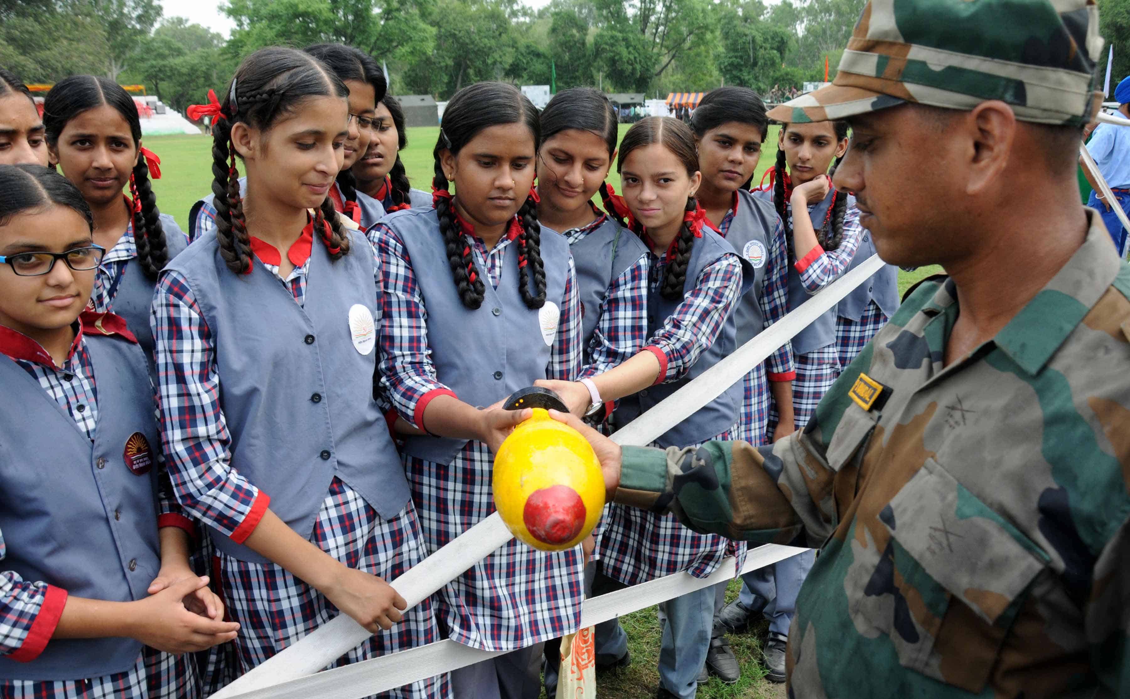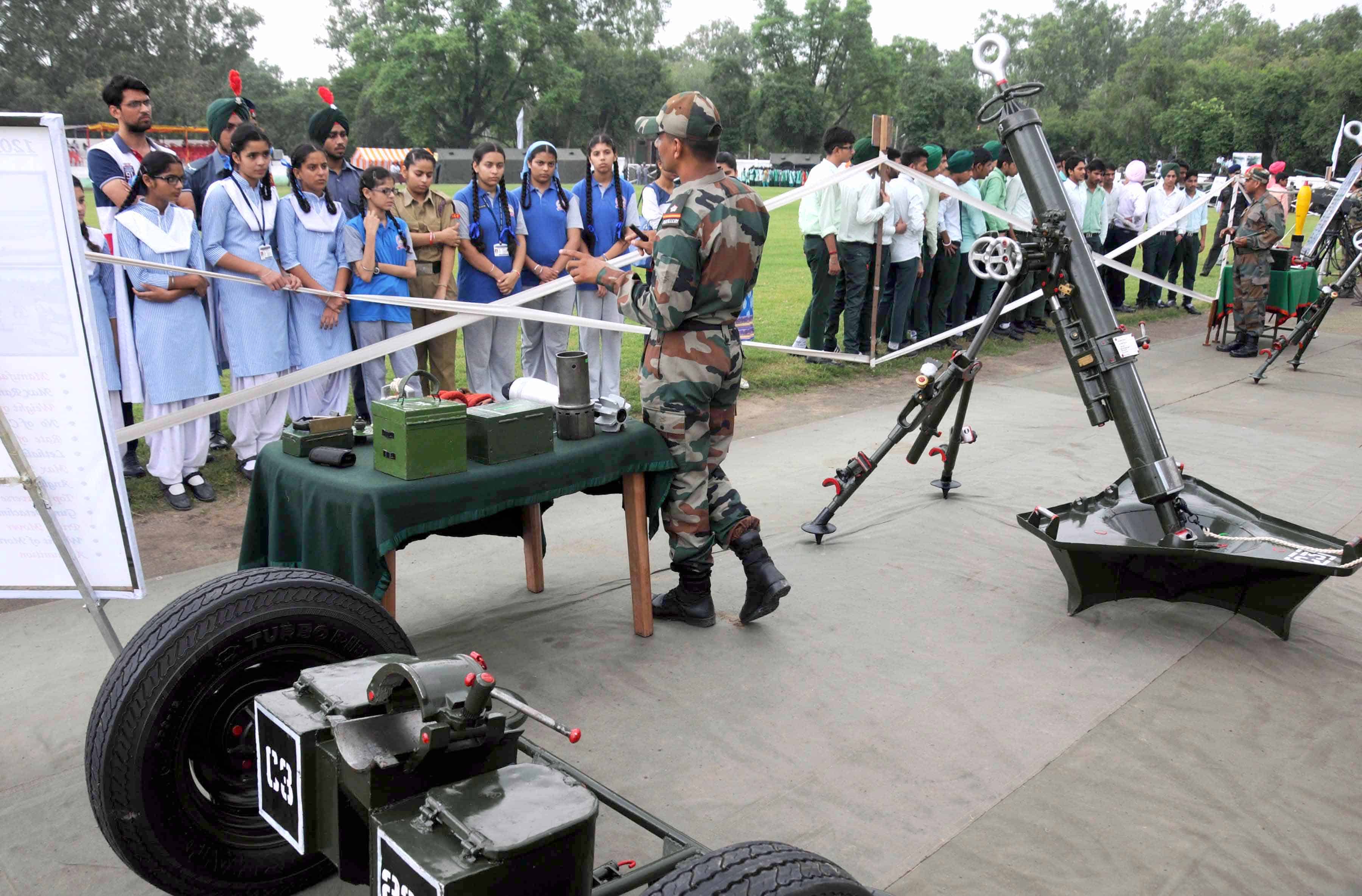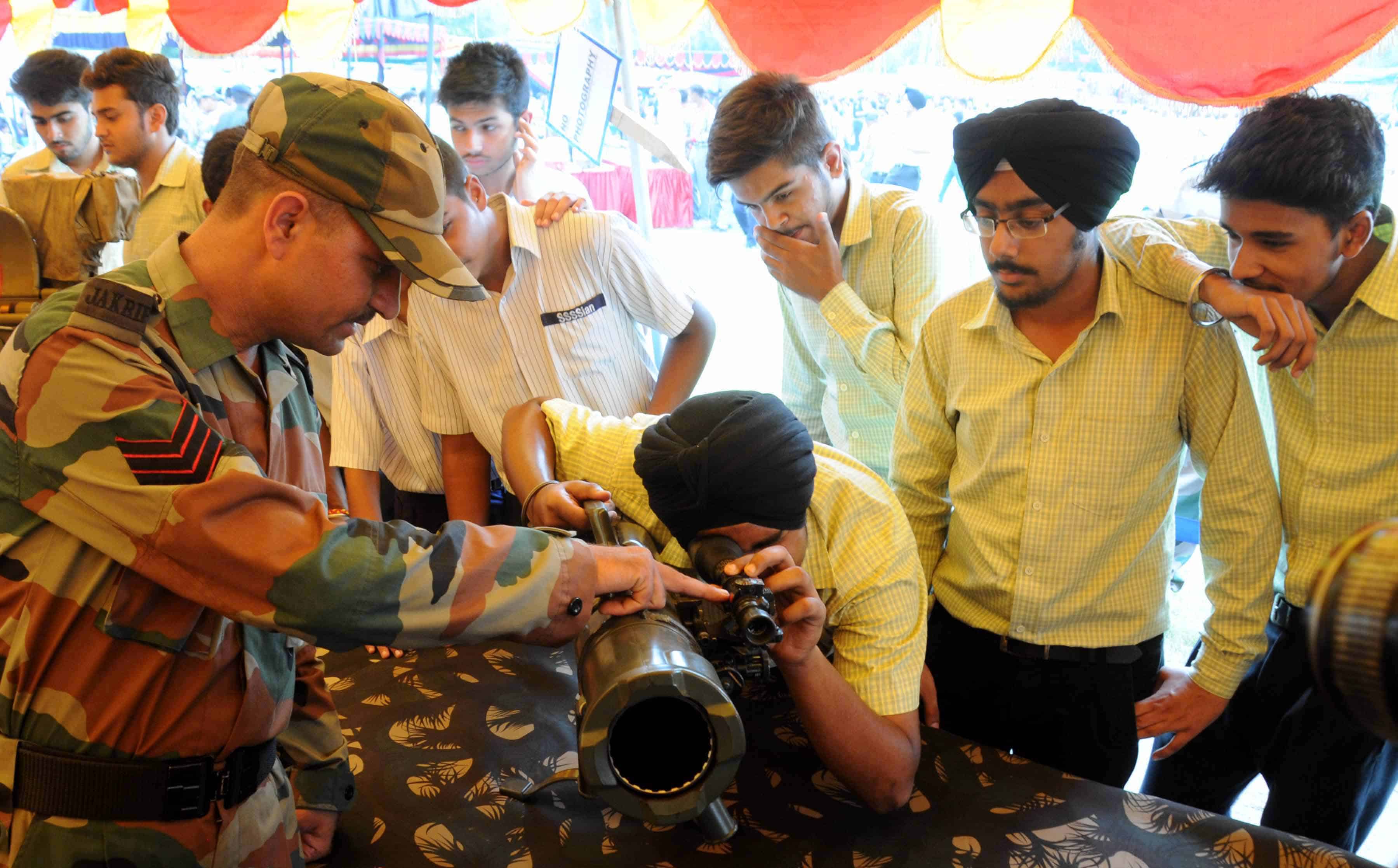 AMRITSAR, AUG 10 (UNI)- Students visiting at ‘Know Your Army’, an exhibition of military equipments in Amritsar on Wednesday. UNI PHOTO-107U