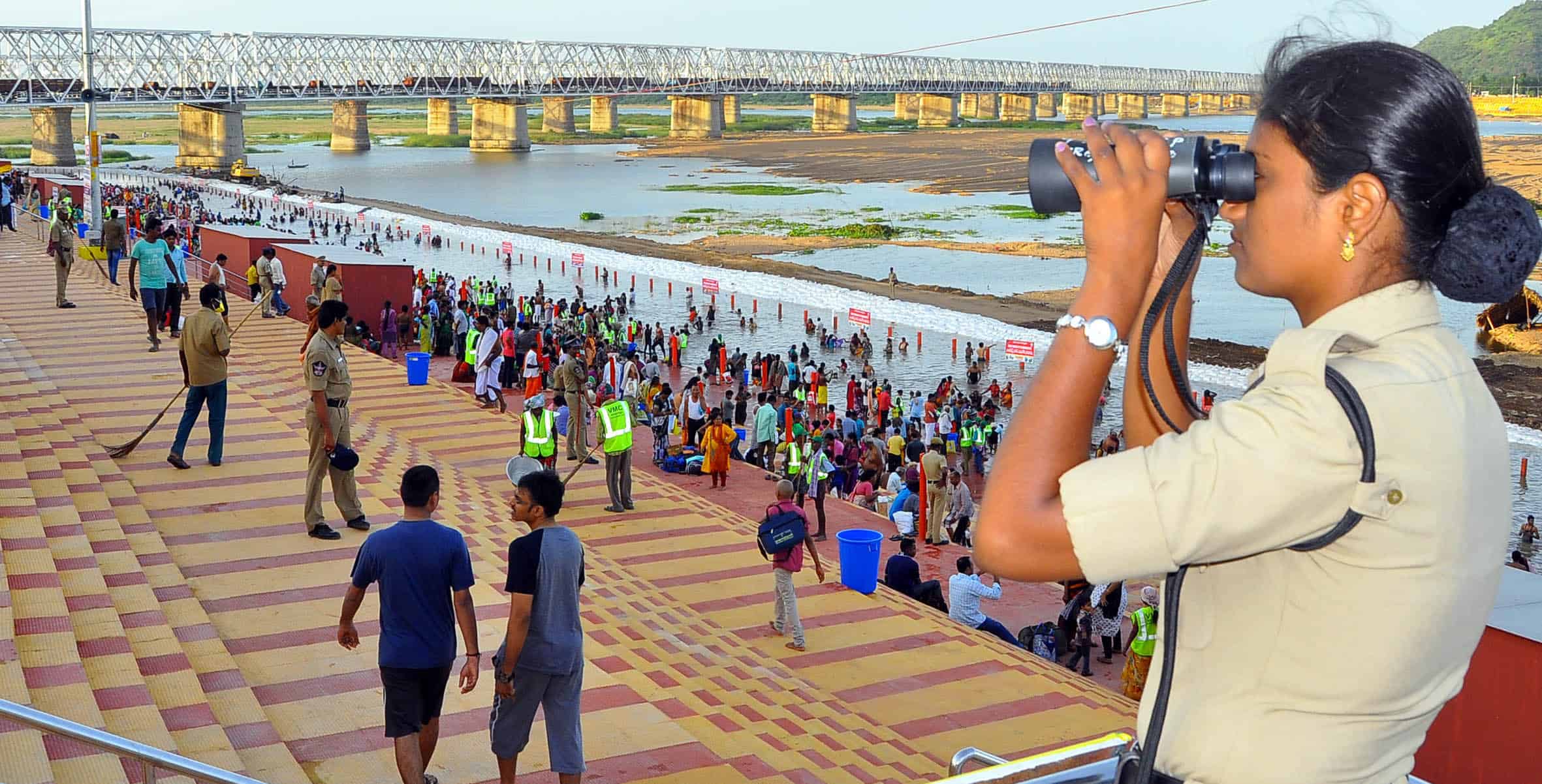 VIJAYAWADA, AUG 12 (UNI)- A police woman keeps vigil on Pushkar Ghats during 12-day Krishna Pushkaram, in Vijayawada on Friday. UNI PHOTO-129