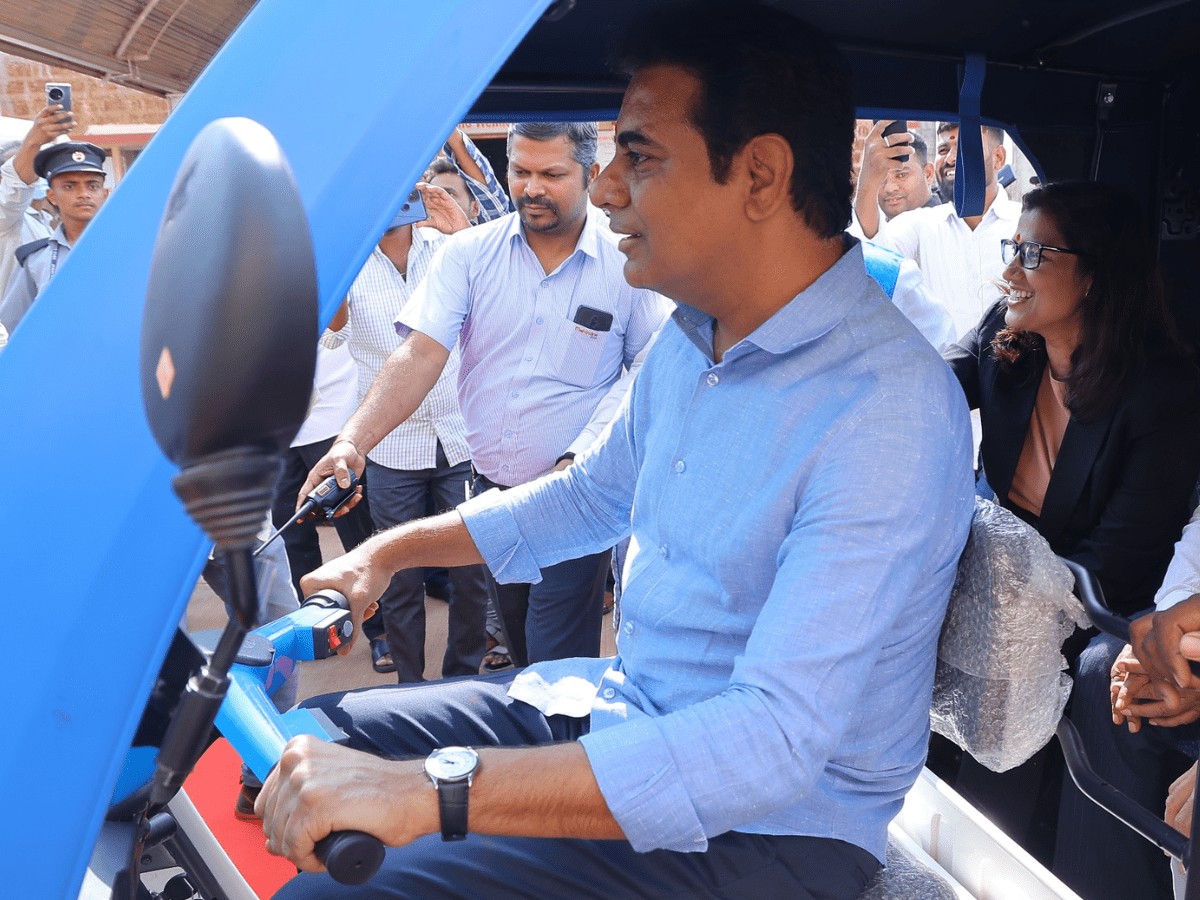 Hyderabad: In an unusual scene, the Telangana IT minister KT Rama Rao drove an electric auto at the groundbreaking ceremony for the electric vehicle manufacturing plant of M&M entity Mahindra Last Mile Mobility in Zaheerabad.