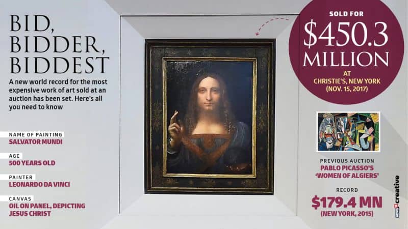 New York: A 500-year-old work of art — believed to be by Leonardo da Vinci and depicting Jesus Christ — sold in New York for USD 450.3 million, smashing a new art auction record, Christie’s said.
