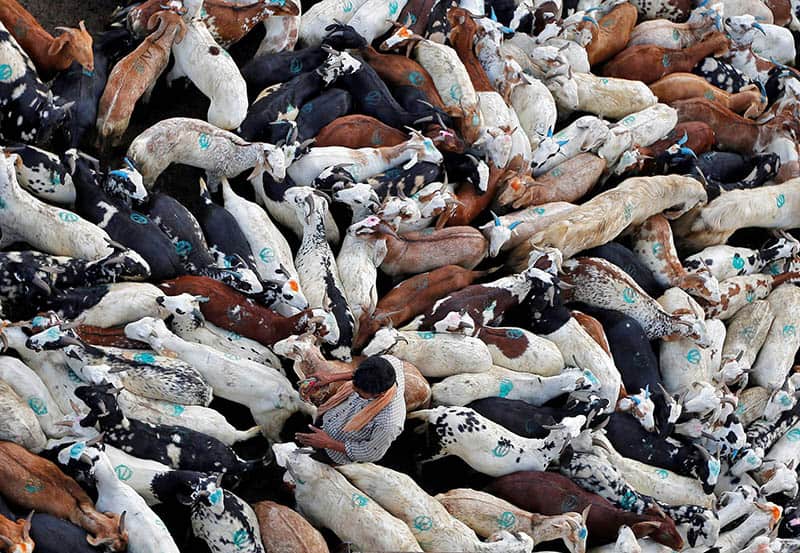 A trader selects a goat for his customer at a livestock market ahead of the Eid al-Adha festival in Mumbai, India, September 10, 2016. REUTERS