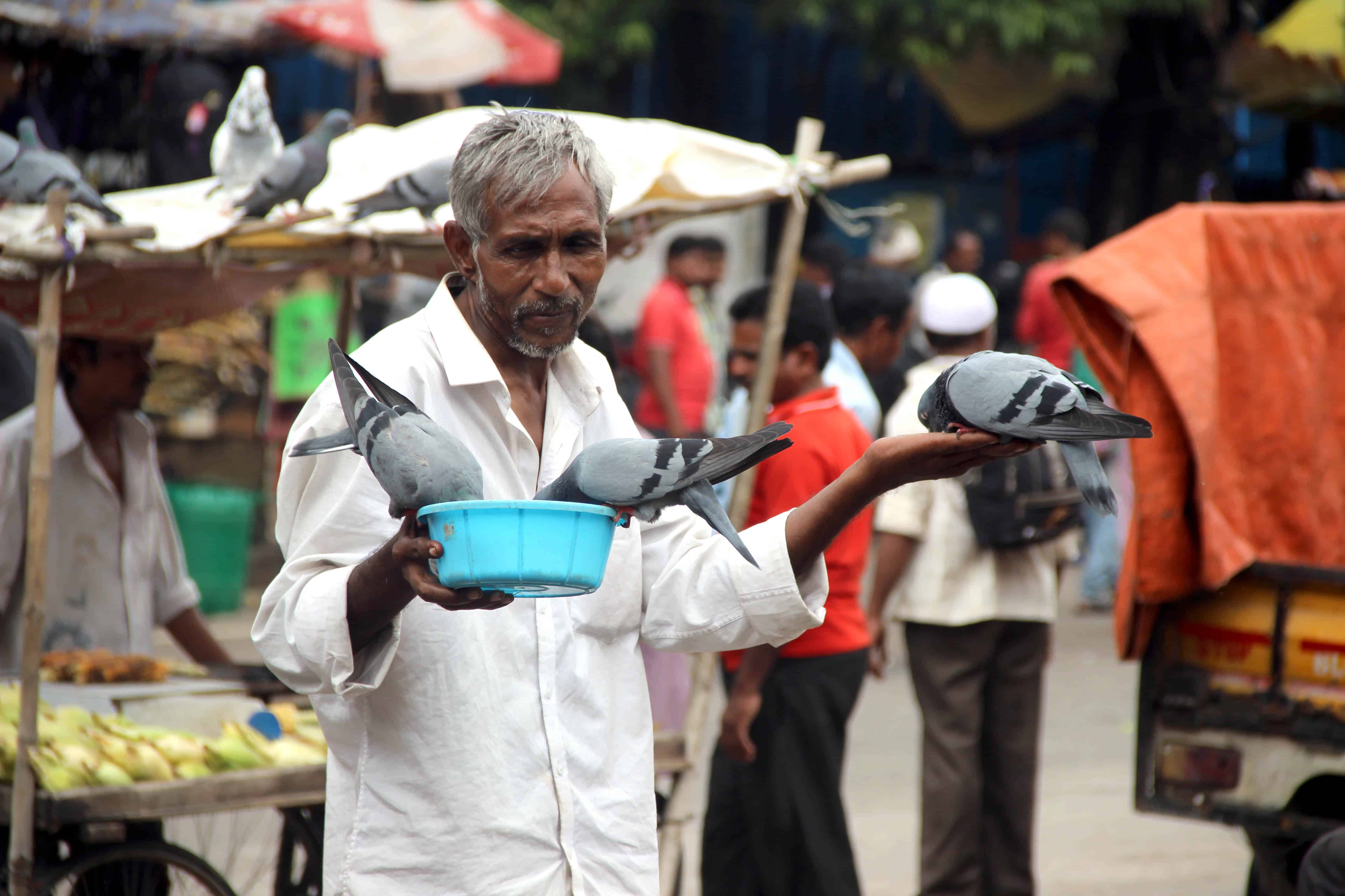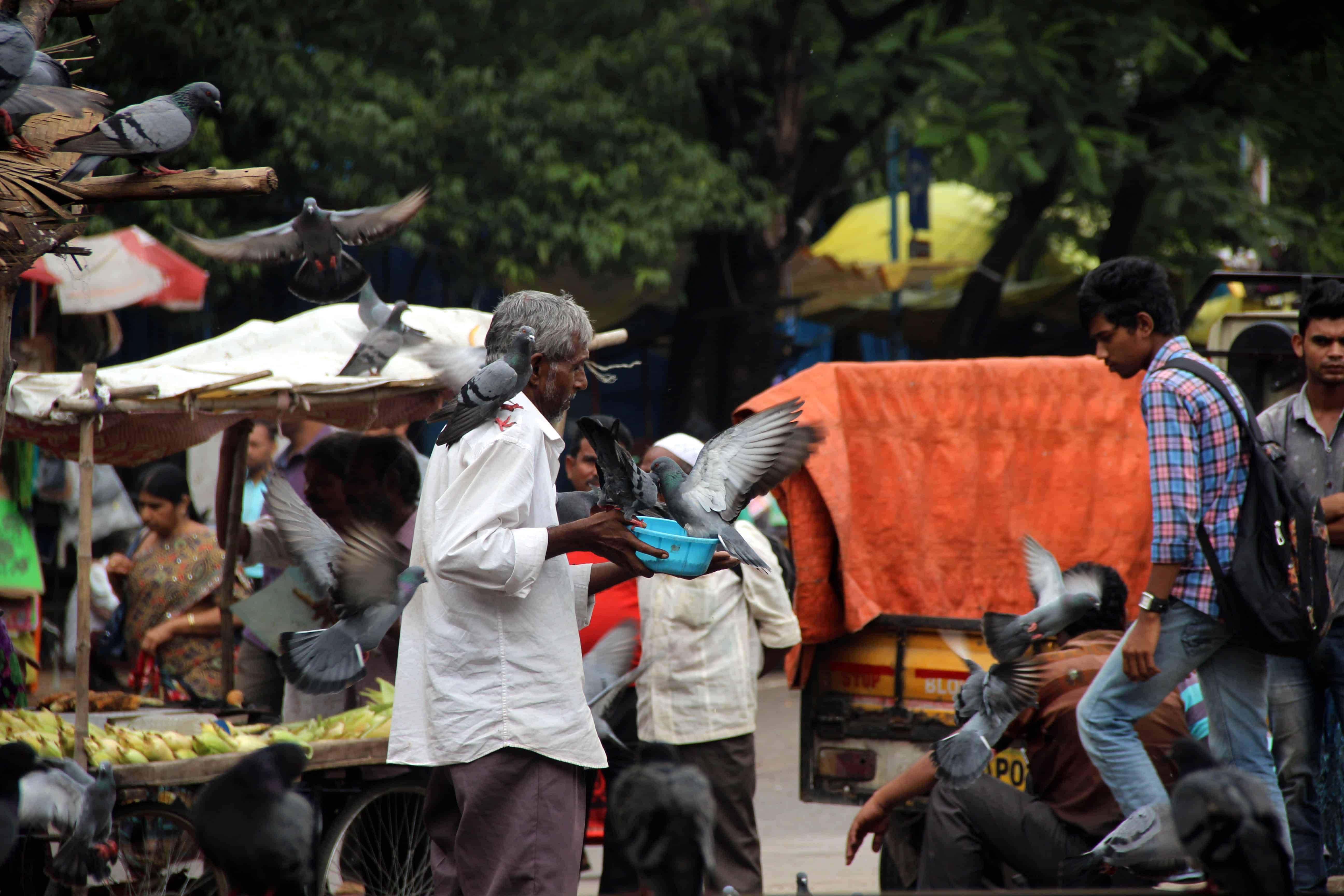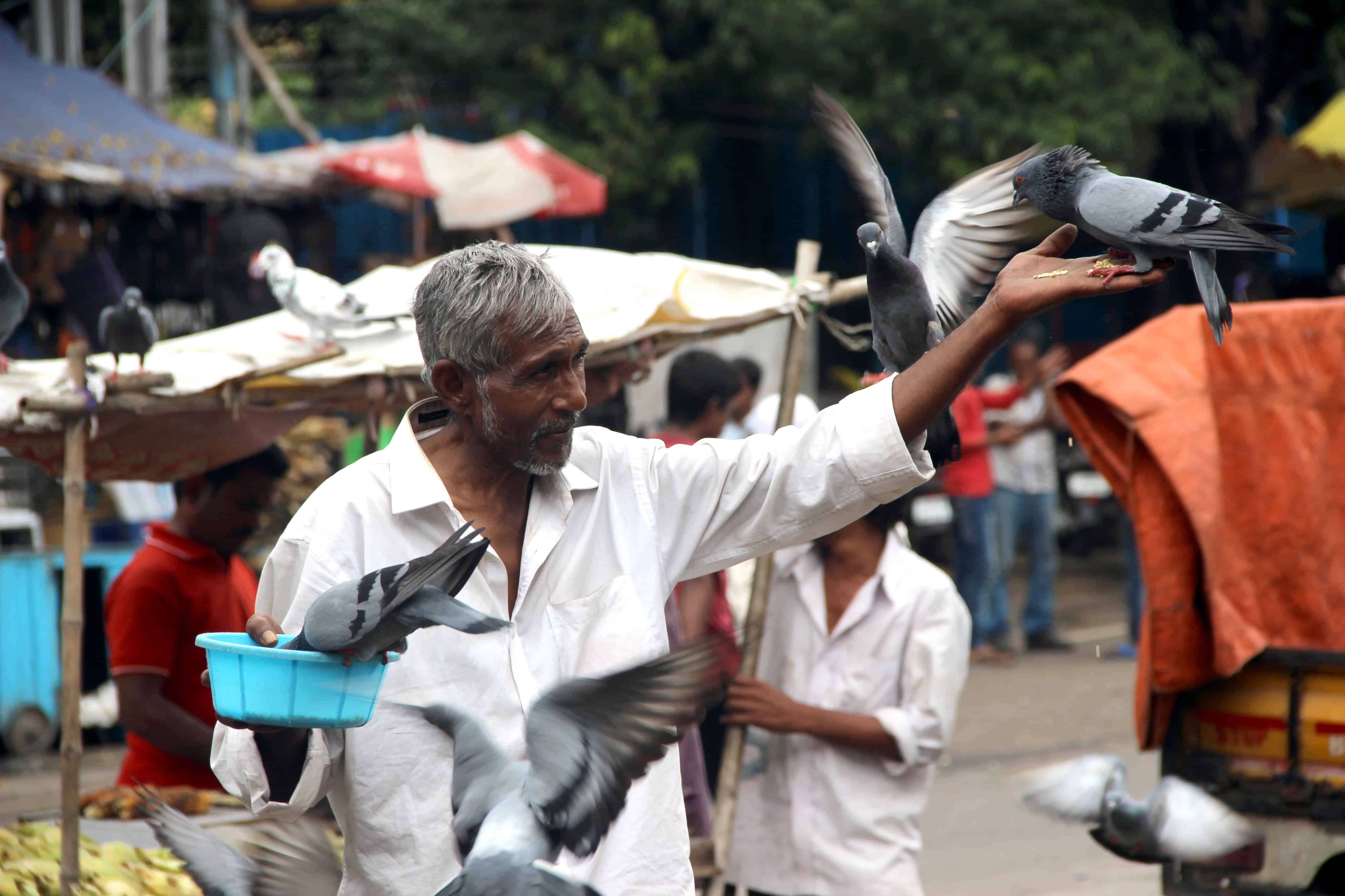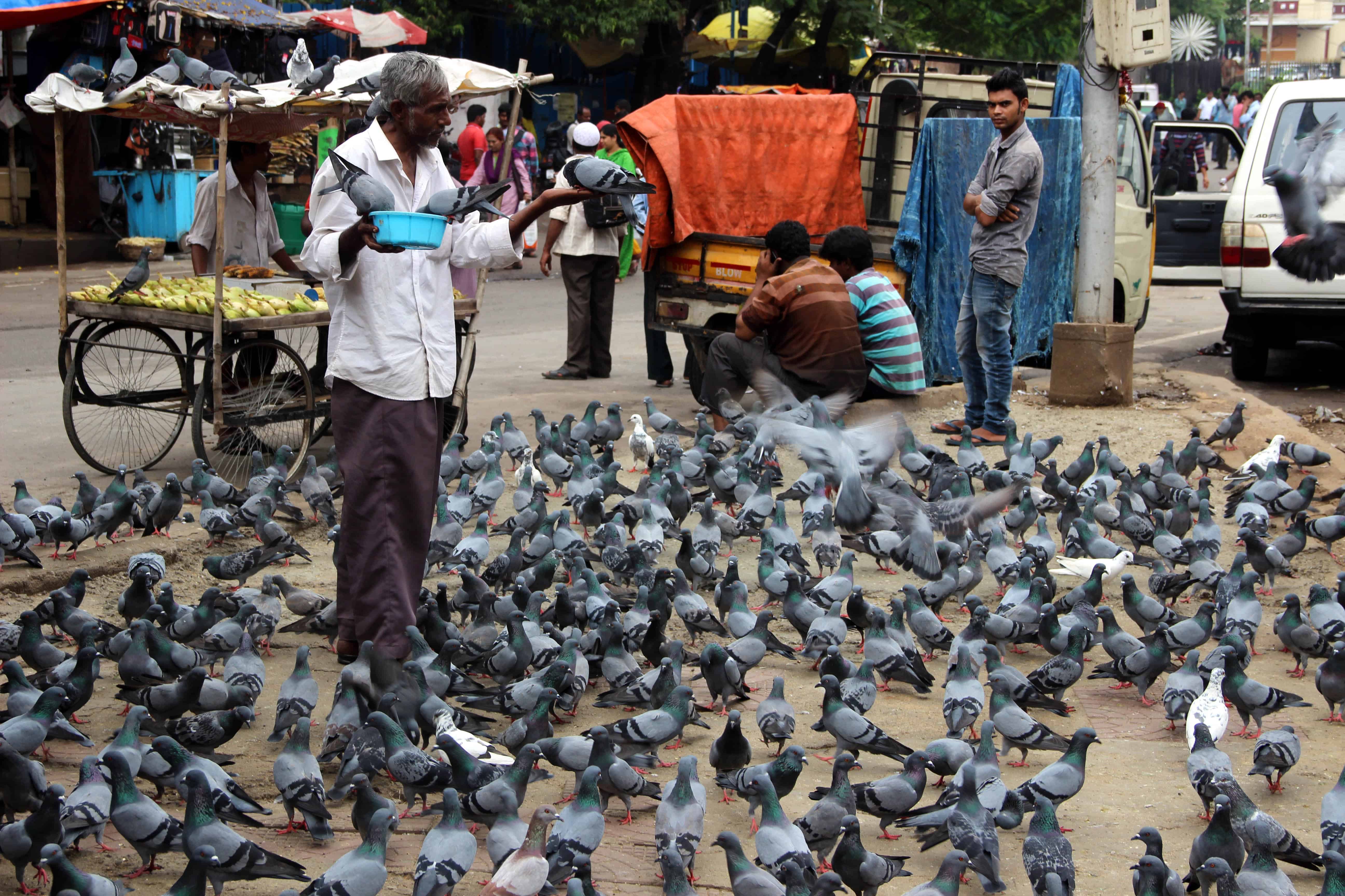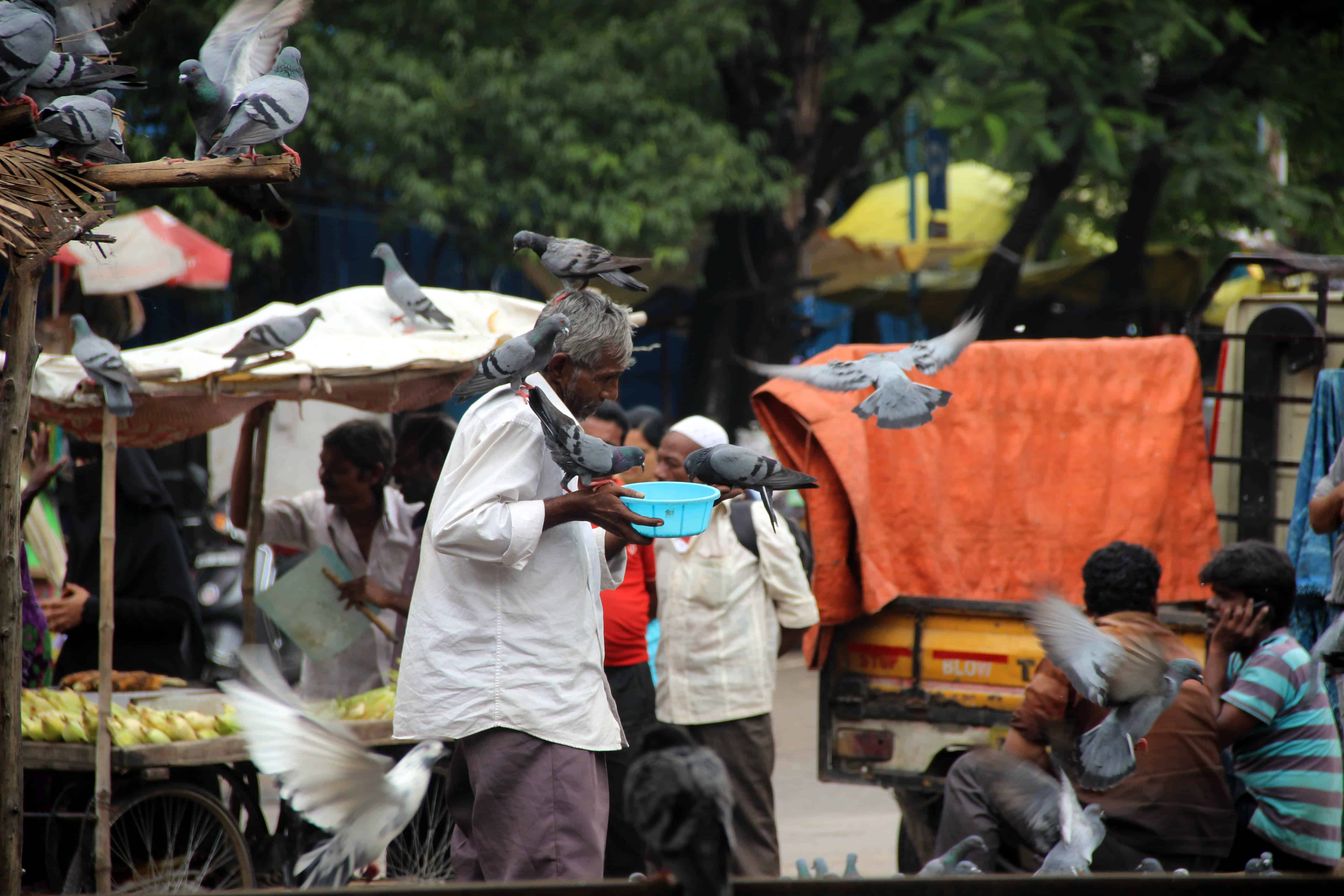 A man lost in feeding the pigeons near Nampally railway station unmindful of his surroundings and bad weather. Photo:Laeeq