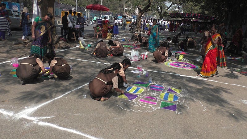 School Students makes beautiful Rangoli at Dharna Chowk, Indira Park in view of Makara Sankranti Festival celebrations. (Photos Faheem Ansari)