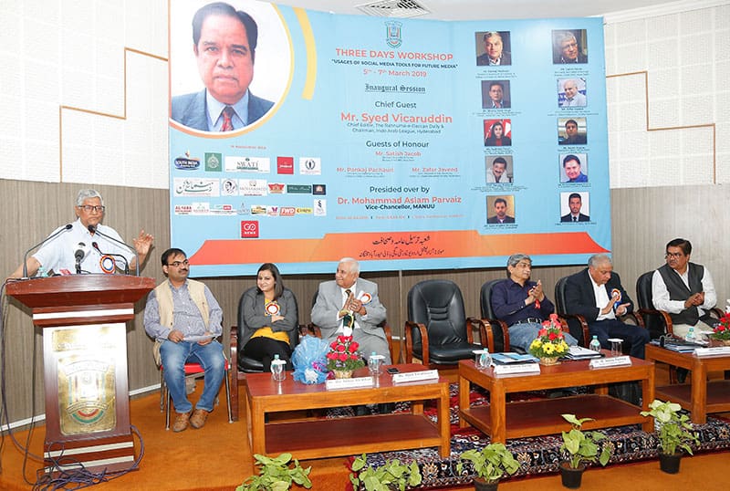Mr. Satish Jacob former correspondent BBC Hindi Service addressing at the inauguration of the three day workshop organised by Department of Mass Communications & Journalism MANUU in Hyderabad on Tuesday,Mir Akbar Ali Khan, Mr. Pankaj Pachuri former Media advisor of Dr. Manmohan Singh Former Prime Minister, Dr. Aslam Parvez VC MANUU, Prof. Ehtesham Ahmed Khan Dean Head Dept. of Mass Communication and Journalism, Mrs. Sadikha Tewari Go News were also seen