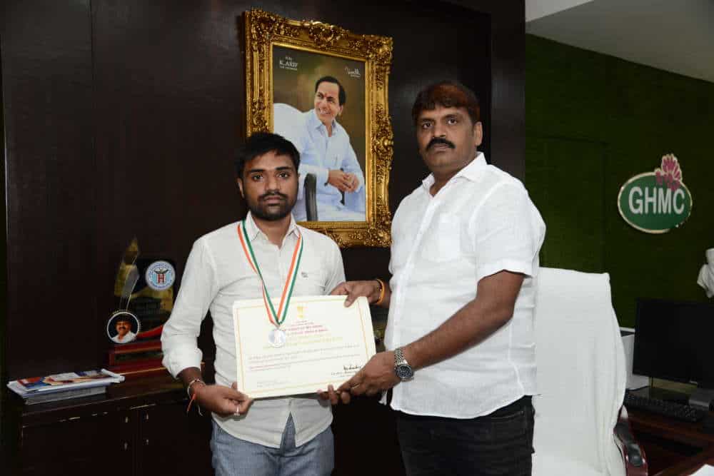 Hyderabad: GHMC Mayor Bonthu Rammohan has felicitated O. Raju Vanshikrishna, who got National Youth Award. The awards will be given to individuals aged between 15 to 29 years and organizations for excellent work and contribution in different fields of development and social service, such as health, promotion of human rights, active citizenship, community service and so on.