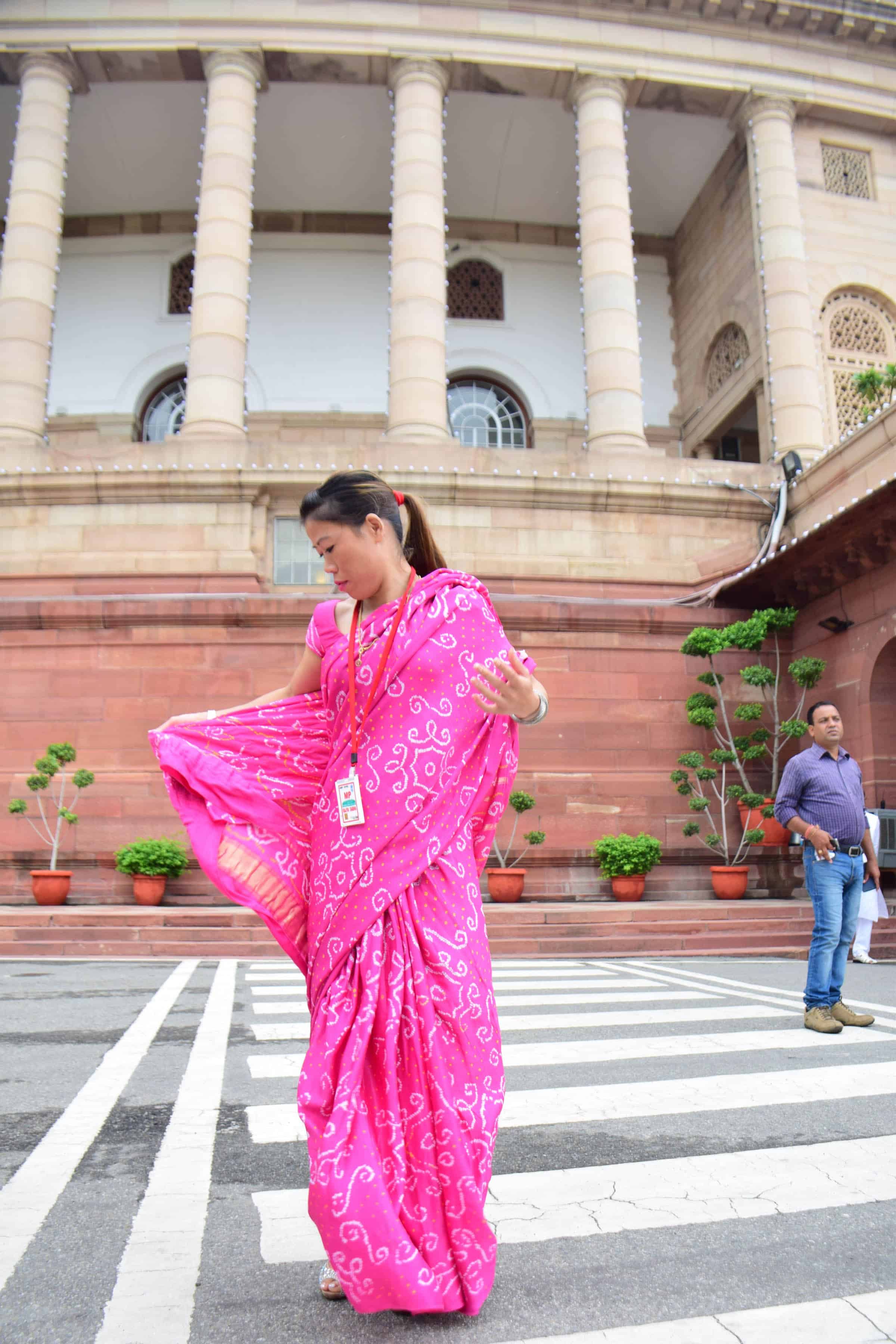 Member of Parliament Mary Kom adjust her saree on arrival at Parliament house in New Delhi on Thursday. UNI PHOTO