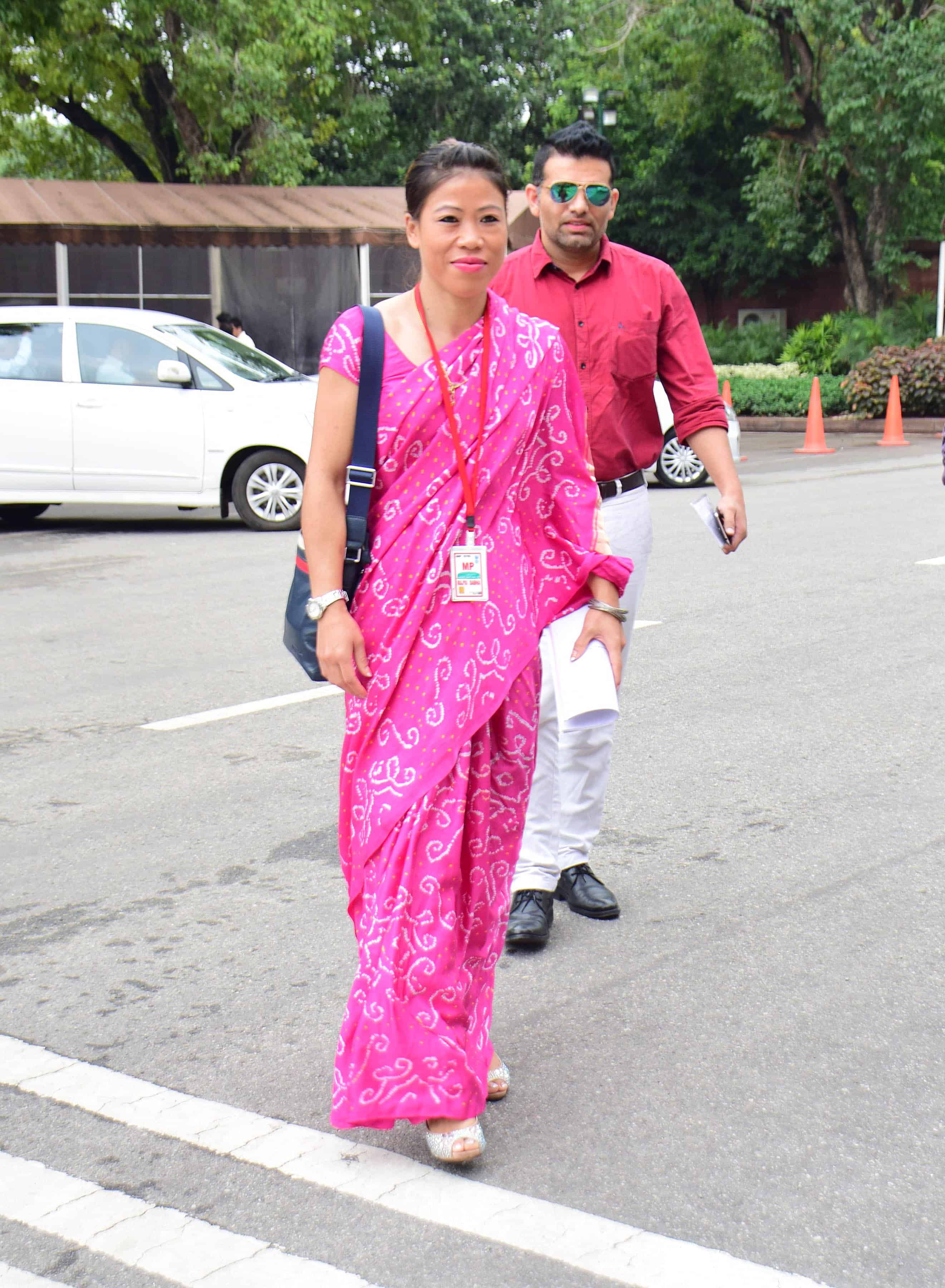 NEW DELHI, AUG 11 (UNI):- Member of Parliament Mary Kom adjust her sharee on arrival at Parliament house in New Delhi on Thursday. UNI PHOTO-20U