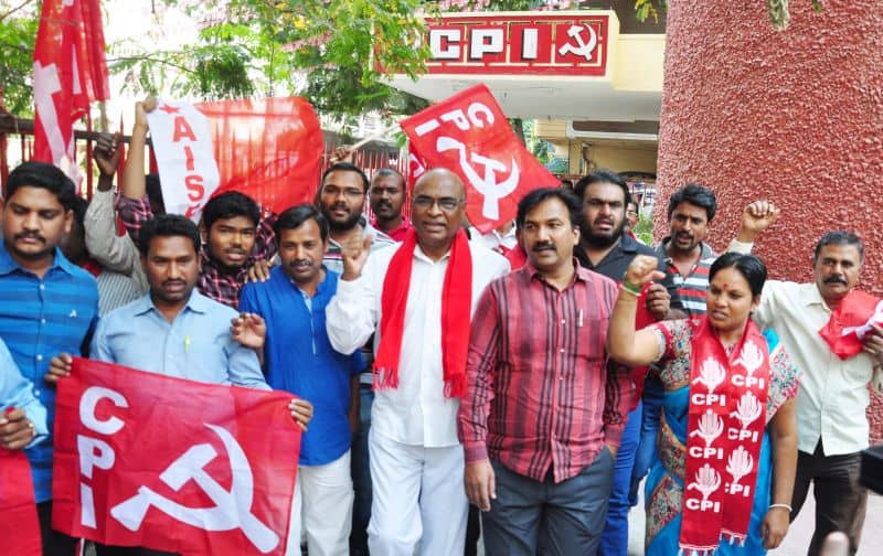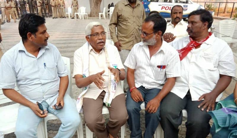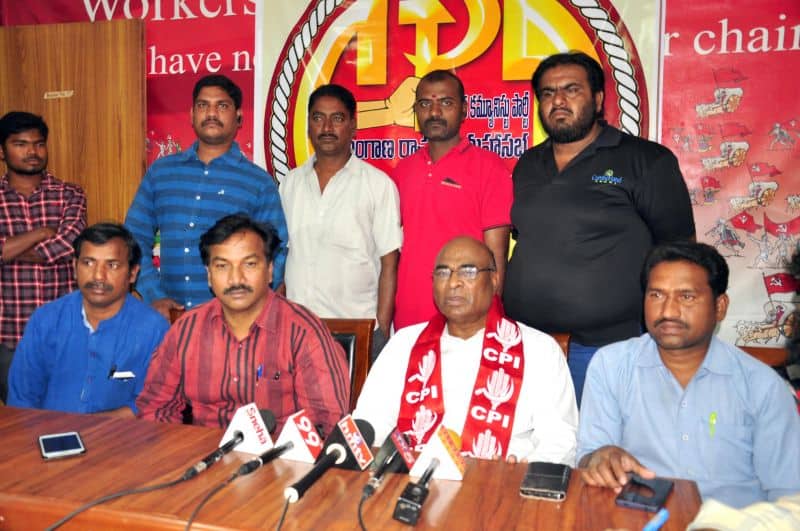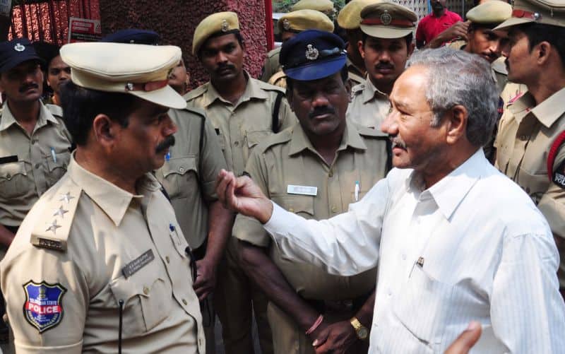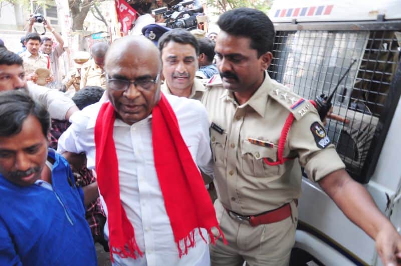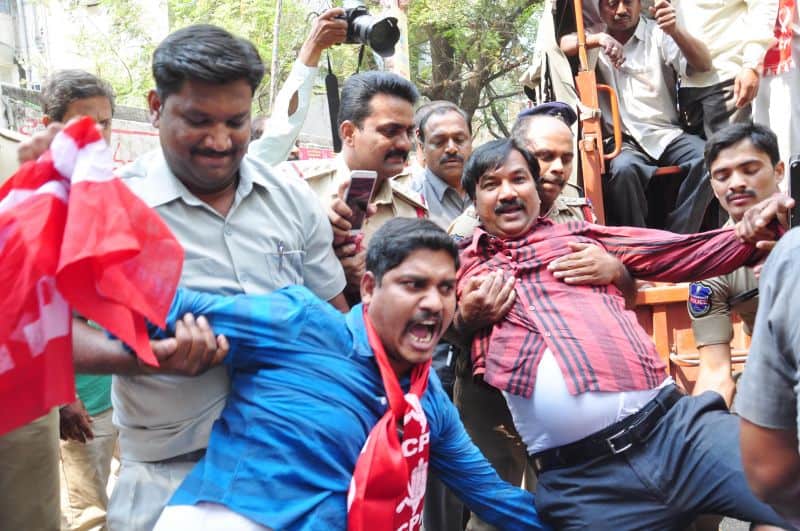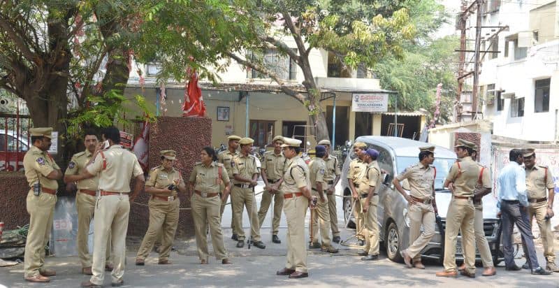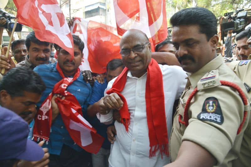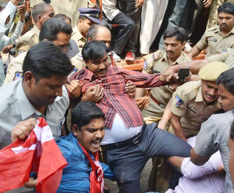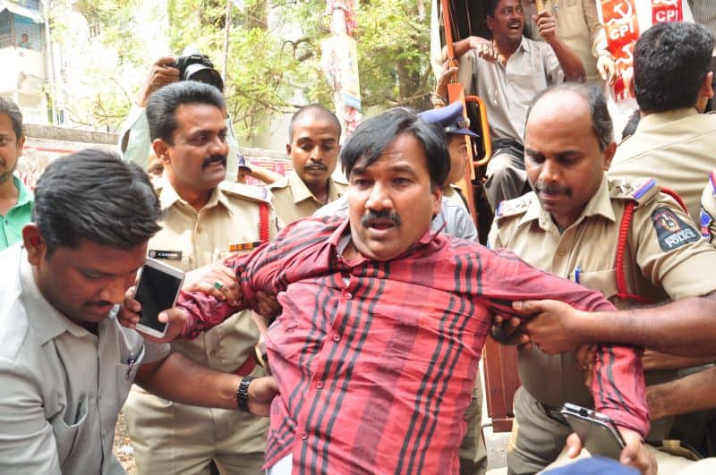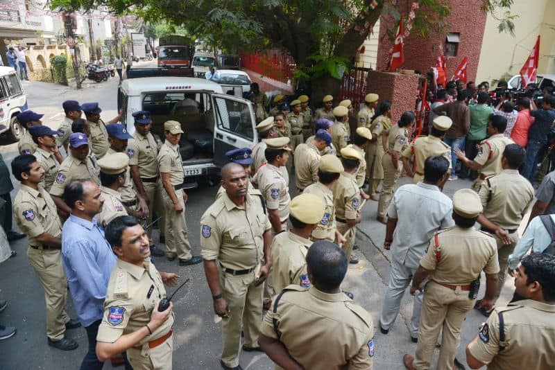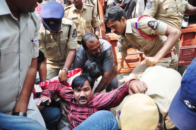 The police arrested Telangana Political JAC chairman Prof. M Kodandaram at his residence here on Saturday when the latter started to go to Tank Bund to attend Million March Spoorthy Yatra from his residence located at Tarnaka. The police shifted Kodandaram to police station in his own vehicle when the latter resisted getting into police vehicle. The police arrested Kodandaram’s followers too leading to tension for some time in Tarnaka. On the occasion, the JAC activists raised slogans making it clear that the government will not stop the aspirations of people while arresting them. They raised protest slogans against the government. The police shifted Kodandaram to Bollaram Police station. The police also detained CPI State secretary Chada Venkat Reddy at Maqdhoom Bhavan and former MLC Kapilavai Dileep Kumar at Tank Bund. The police erected 350 check-posts around the Tank Bund to see that no untoward incident take place. The police erected barricades two sides of Tank Bund. CPI leaders Chada Venkat Reddy, Syed Azeez Pasha and many more was also arrested from CPI party headquarter Maqdoom Bhavan. (Photo: Zabi)